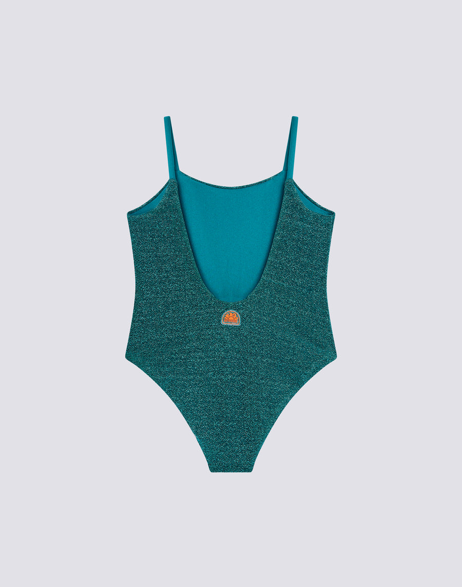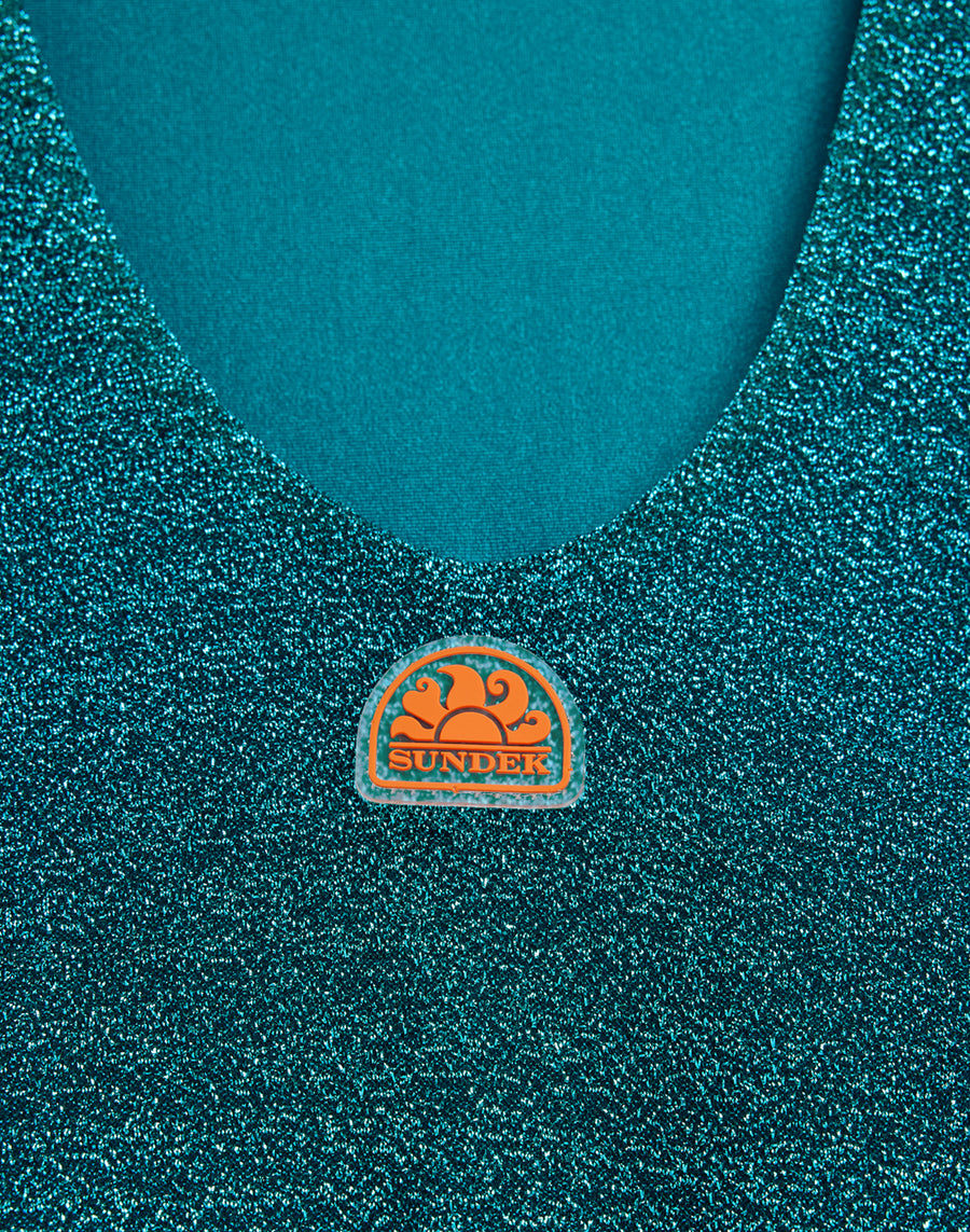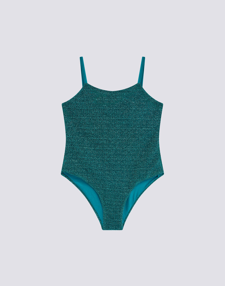 Scintillante grazie al lurex, da sfoggiare sulla riva o in una giornata in piscina, in coordinato col modello da adulto per la mamma.