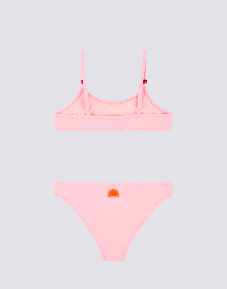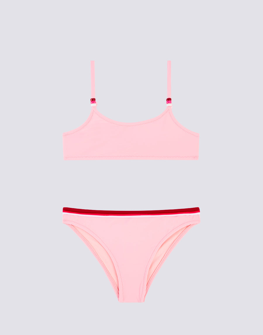 Bikini mare bambina con top regolabile con i laccetti impreziositi da perline. Il colore delle perline è riproposto sul dettaglio tricolore dello slip. I due pezzi del costume sono realizzati in tessuto VITA by Carvico confortevole, resistente e che non teme cloro e creme solari.