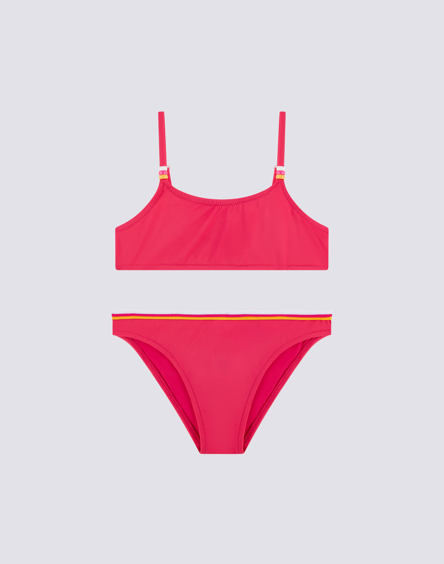 Bikini mare bambina con top regolabile con i laccetti impreziositi da perline. Il colore delle perline è riproposto sul dettaglio tricolore dello slip. I due pezzi del costume sono realizzati in tessuto VITA by Carvico confortevole, resistente e che non teme cloro e creme solari.