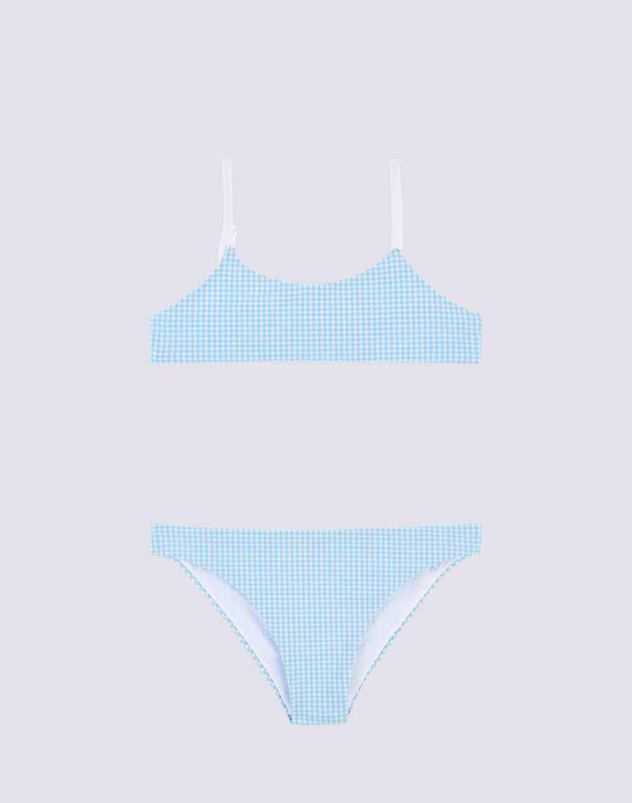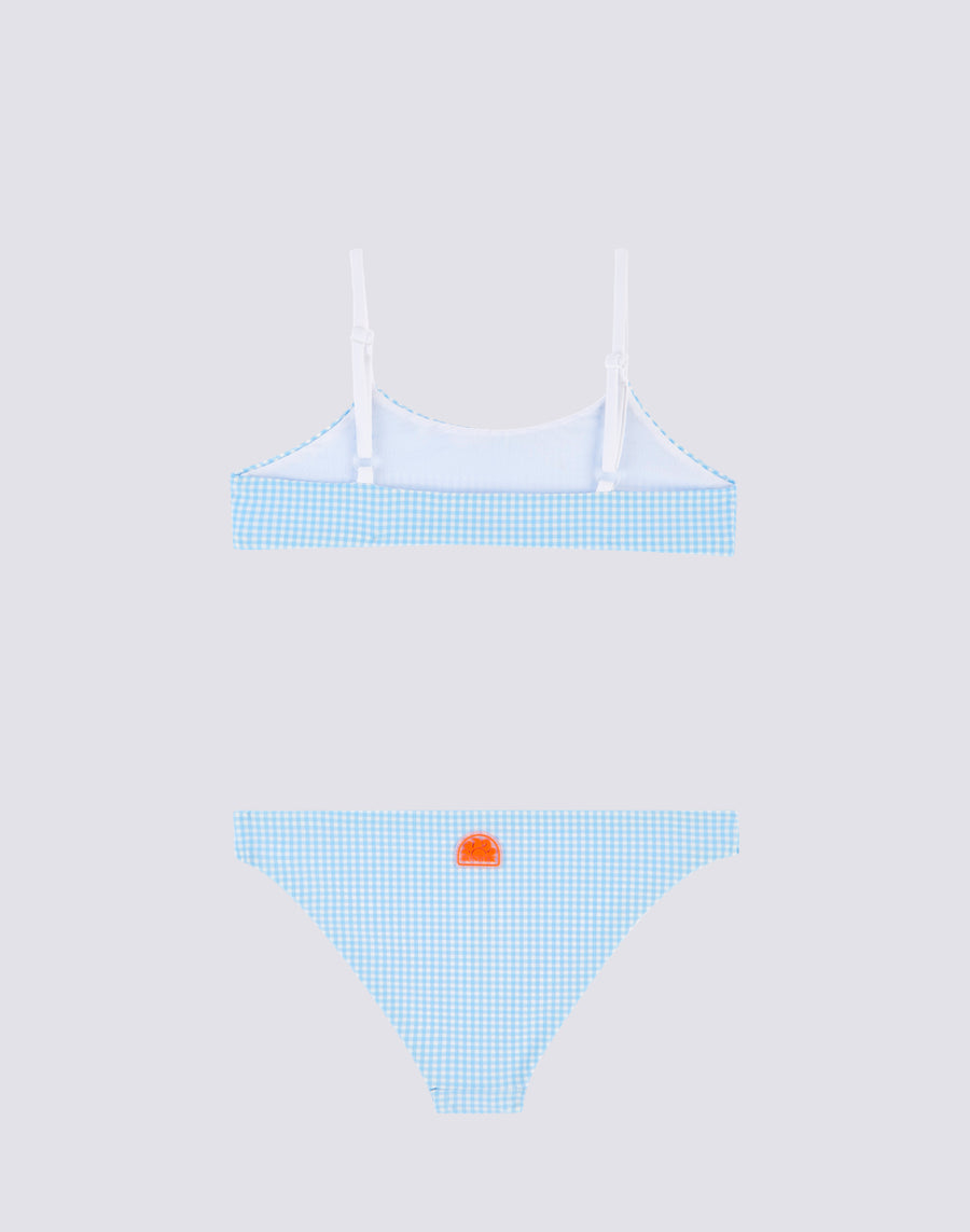 Costume a 2 pezzi da bambina composta da top bralette e slip fisso in fantasia vichy.