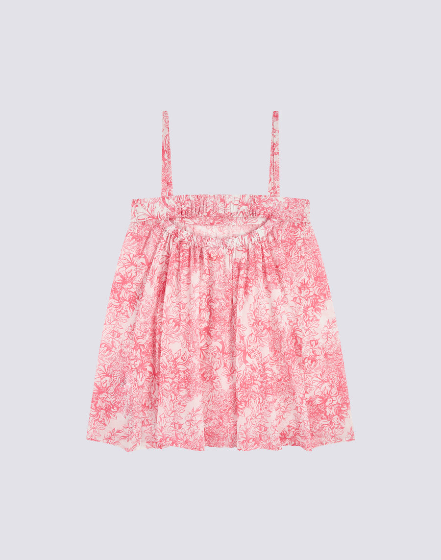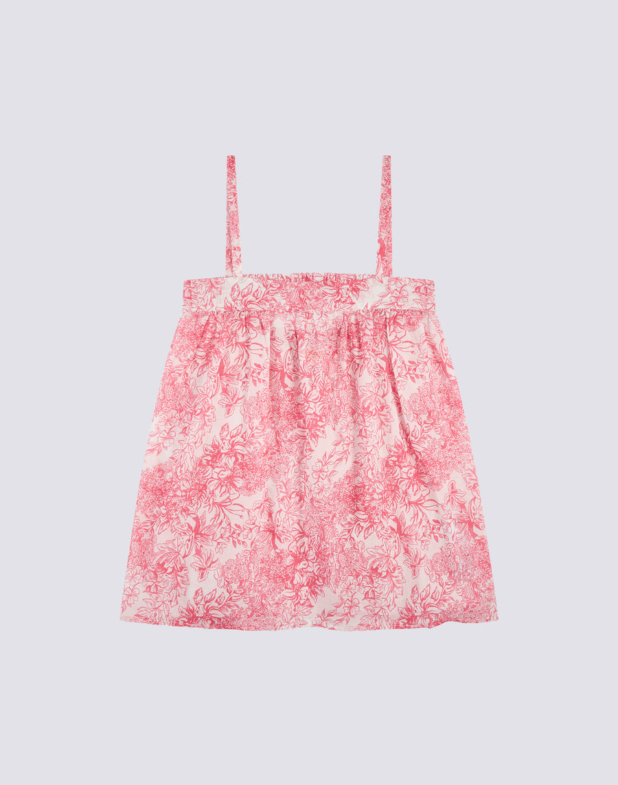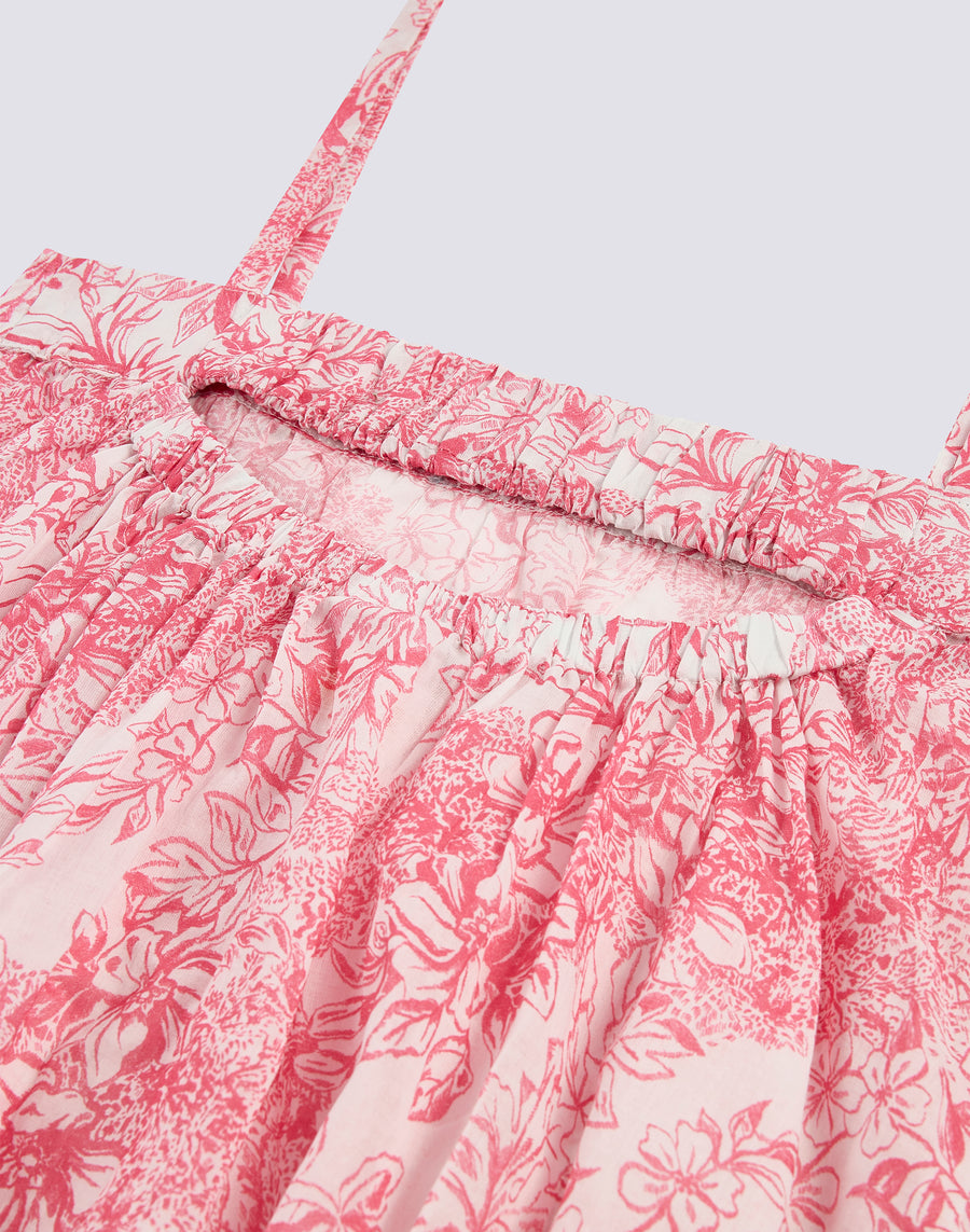 Abito corto da bambina senza maniche con elegante stampa Fleur de Joie. Con spalline e laccio dietro la schiena arricciabili ed elasticizzati, è il capo ideale da indossare per occasioni speciali.
