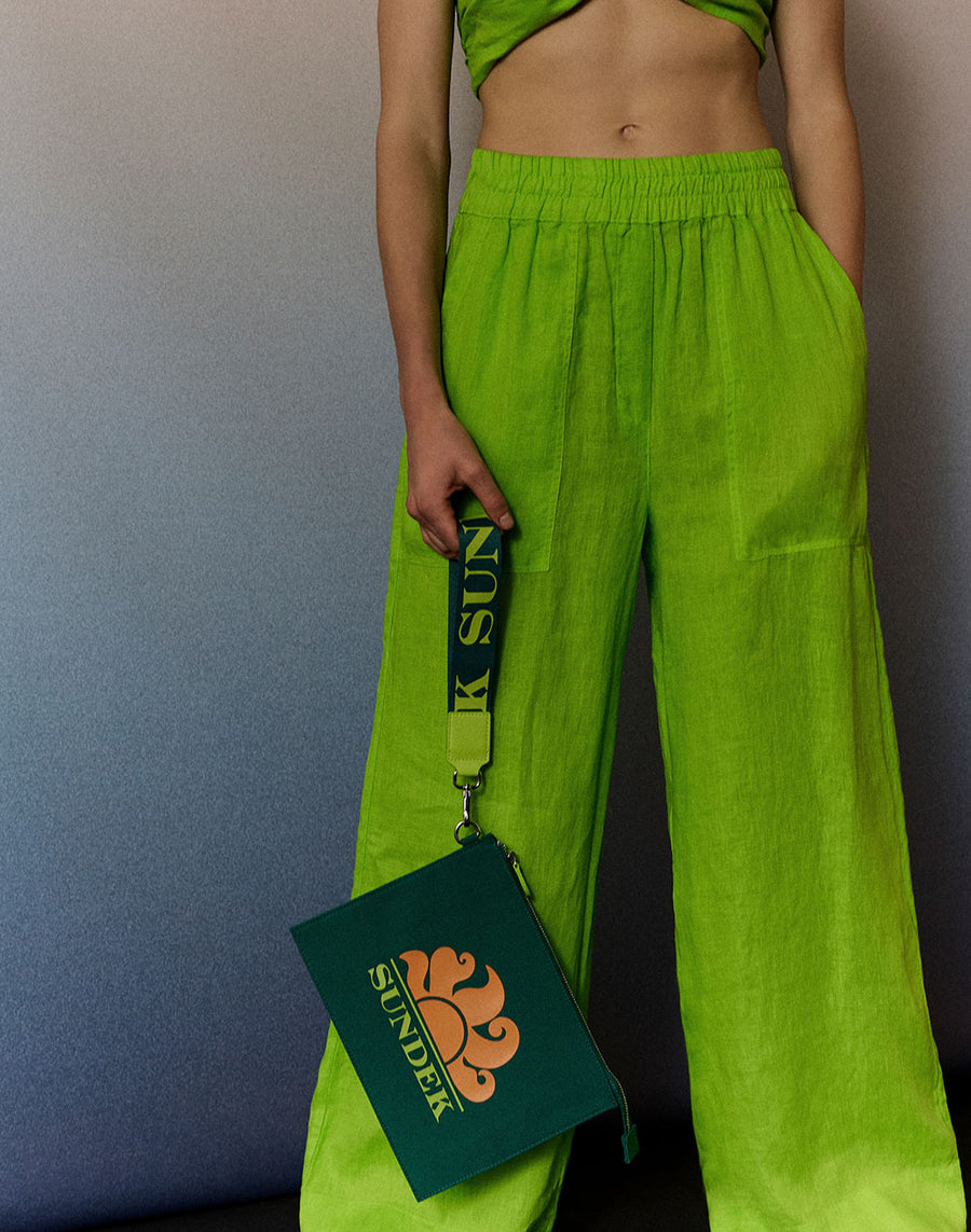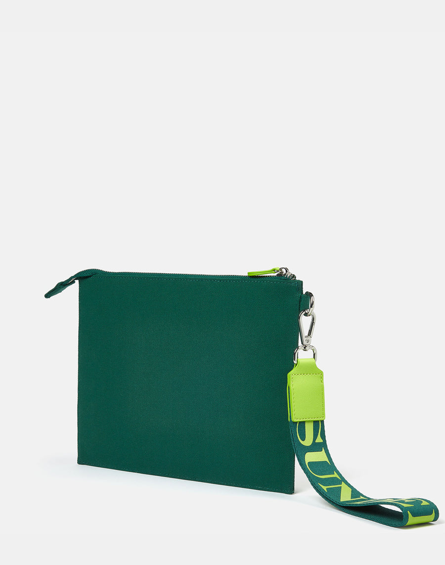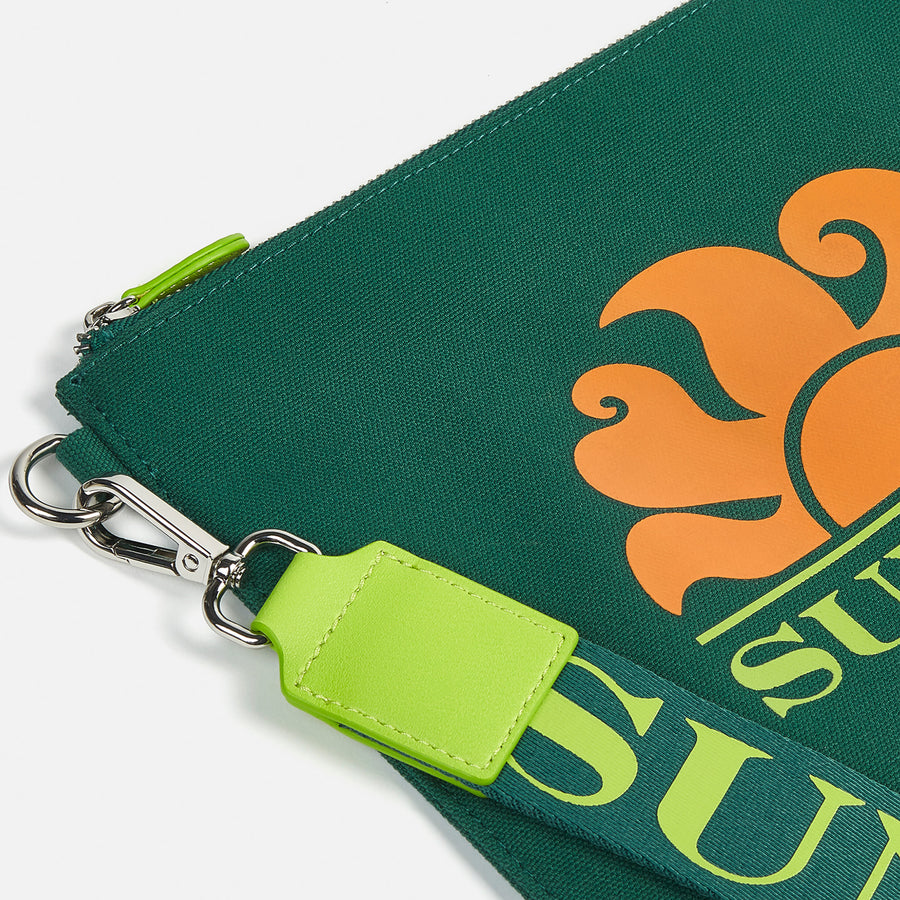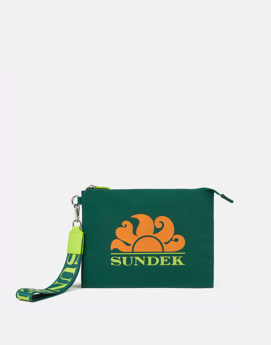 Clutch in canvas con logo sundek stampato.Perfetta sia come necessaire che da portare come pochette legata al polso. Laccetto con logo rimovibile. Misure: 27 x 20.5cm