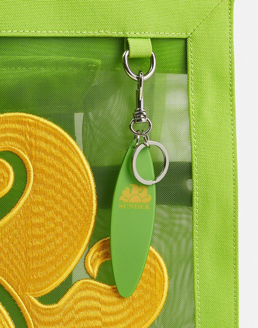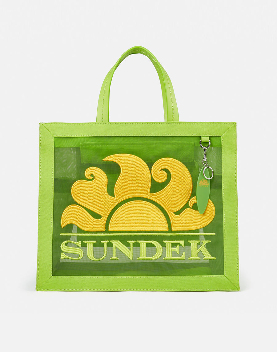 Borsa in mesh con logo Sundek ricamato. Questa borsa è perfetta per la spiaggia grazie alla sua rete a trame sottili che impediscono il passaggio della sabbia. Charm tavola da surf applicato.