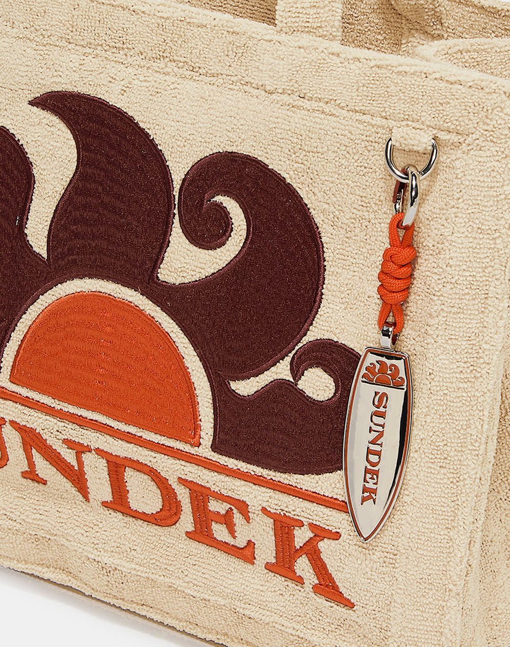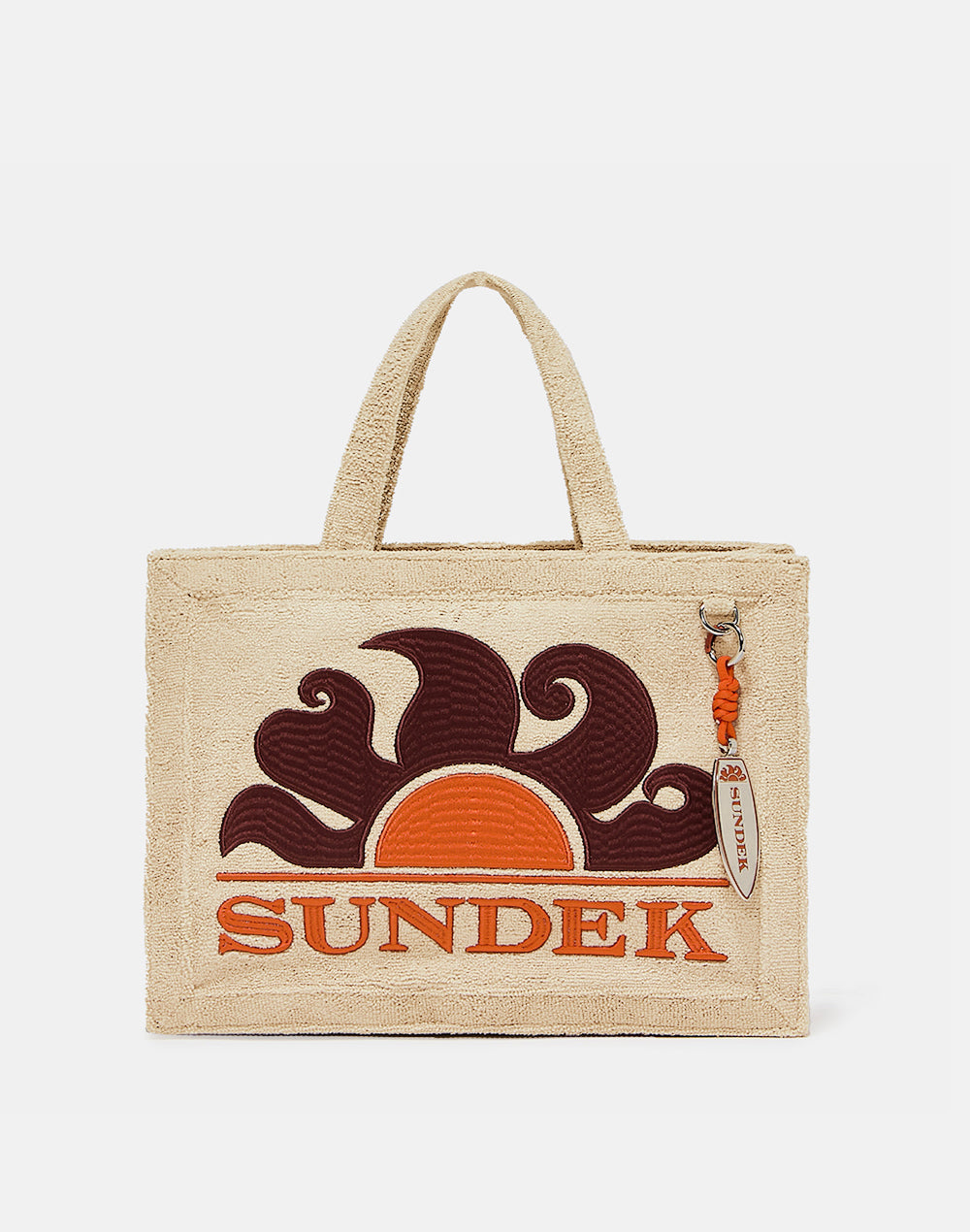 Borsa media a mano in spugna con logo ricamato. Charm con la caratteristica forma di tavola da surf.