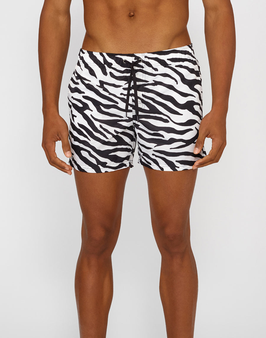 Preparati a cavalcare la prossima onda con il costume da bagno corto a vita elasticata con speciale stampa a fantasia animalier. Grinta e carattere convivono in questo modello dalla vestibilità a vita bassa, realizzato in tessuto satin.