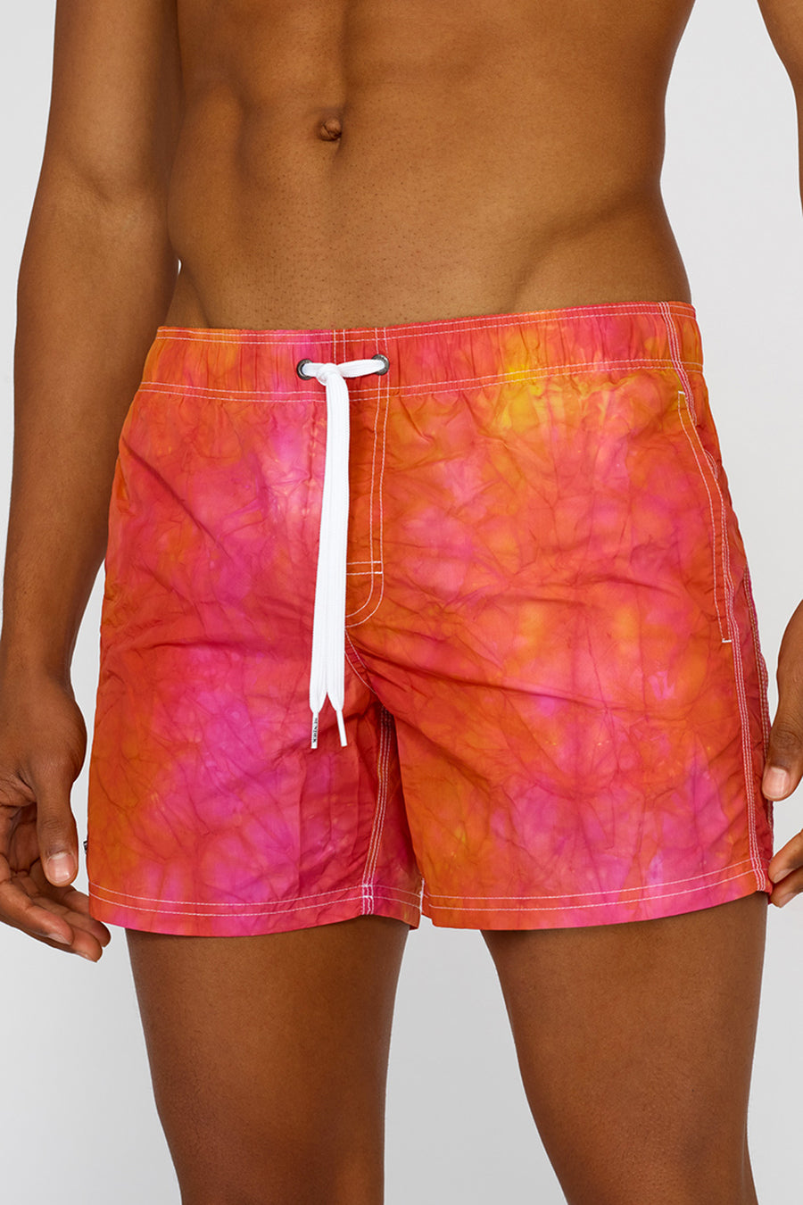 Preparati a cavalcare la prossima onda con il costume da bagno corto a vita elasticata con speciale lavorazione tie-dye, trattato e tinto con tecniche artigianali. Il tessuto storico nylon taffeta e la costruzione del modello lo rende veloce nell'asciugatura e super resistente stagione dopo stagione. Vestibilità a vita bassa.