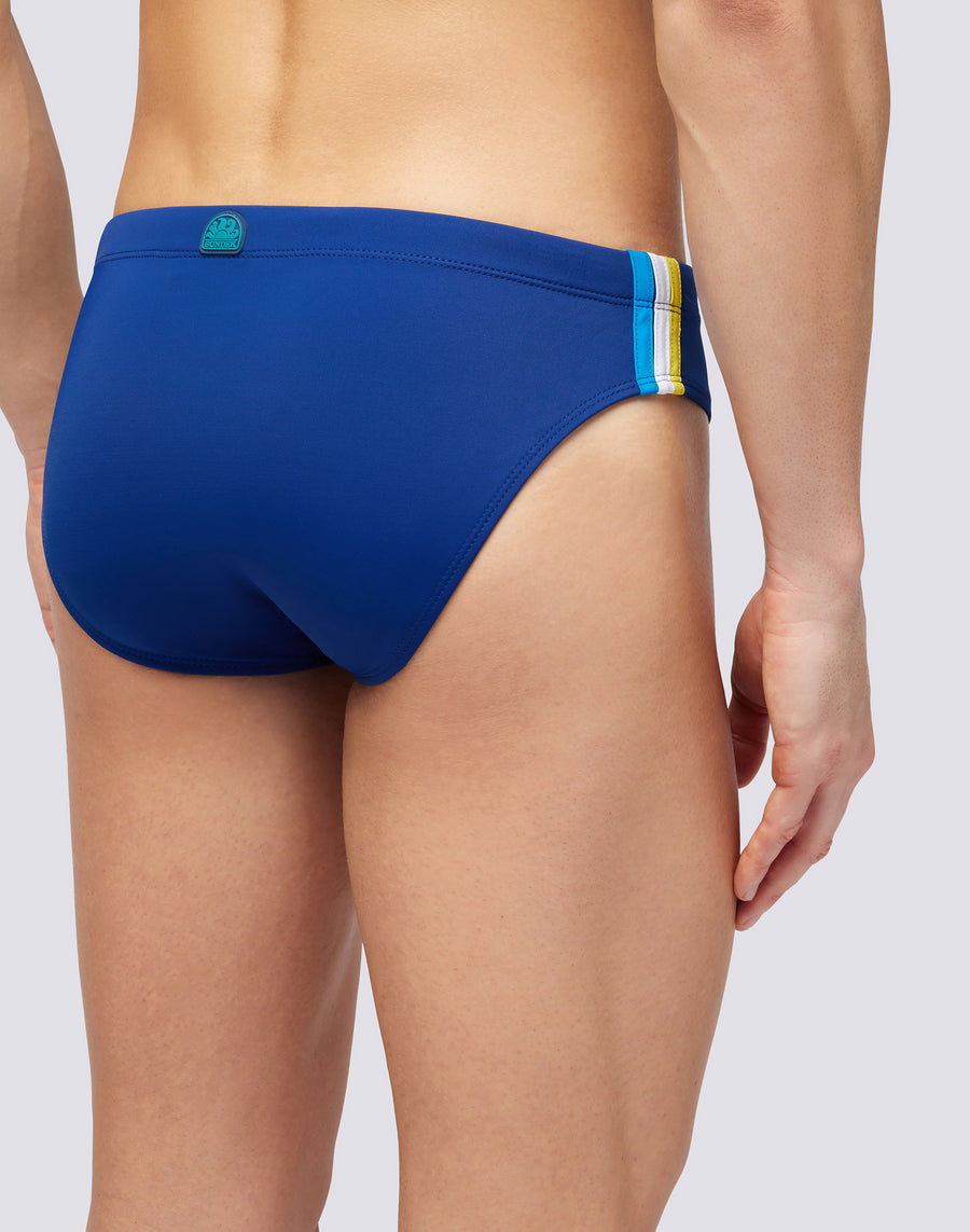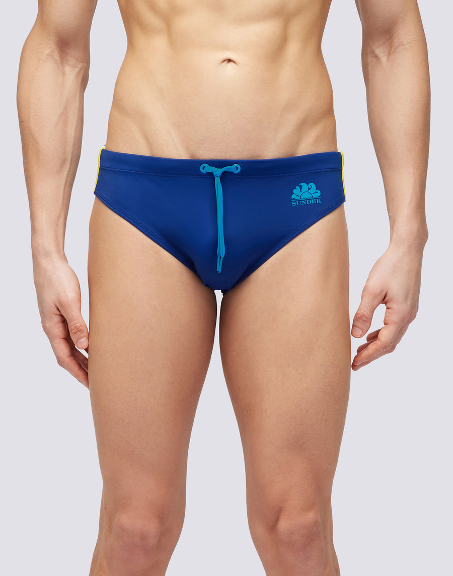 Costume slip uomo tinta unita e vita regolabile. Lo slip da mare monocromo con laccio coulisse e tre bande laterali colorate a contrasto per un look deciso e funzionale. Si asciuga velocemente e ti dà comfort e resistenza in acqua e fuori dall'acqua: indossalo per nuotare e allenarti e quando ti riposi e prendi il sole.