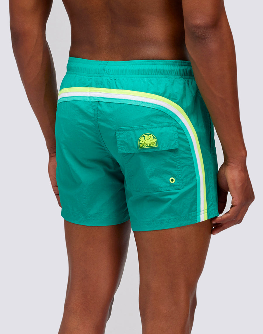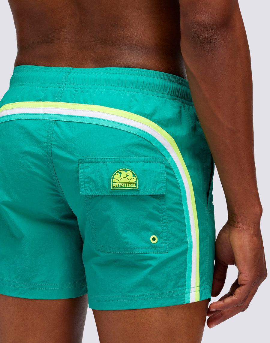 Costume uomo corto in tinta unita con colori brillanti. Leggero, resistente, si asciuga rapidissimo ed è realizzato in nylon taffeta, l'iconico tessuto Sundek. Ha le nostre classiche cuciture a tre aghi che aumentano la resistenza nel tempo e il nostro arcobaleno sul retro.