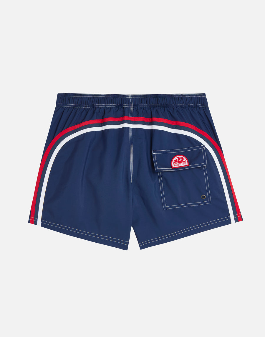 Costume da bagno a pantaloncino da uomo in tessuto riciclato Repreve®, tessuto super leggero dall'asciugatura rapida. Dettaglio iconico arcobaleno Sundek sul back e rappresentazione bandiera degli Stati Uniti. Lunghezza esterno coscia 14”/35 CM (in taglia M).