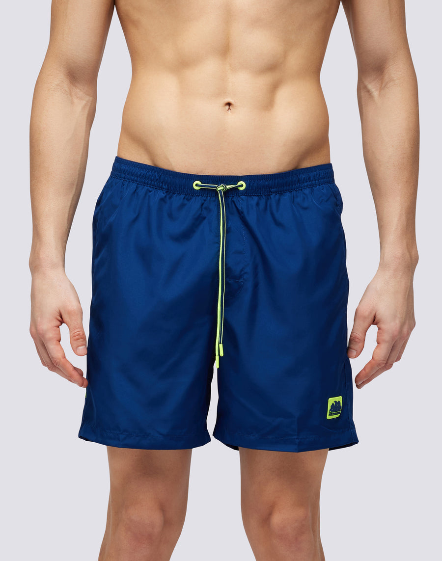 Costume da bagno uomo a pantaloncino lunghezza media a vita elasticata. Dotato di coulisse e tasca posteriore con zip. Si asciuga rapidamente grazie al poliestere leggero con cui è realizzato. Lunghezza esterno gamba 16"/41 cm (in taglia M).