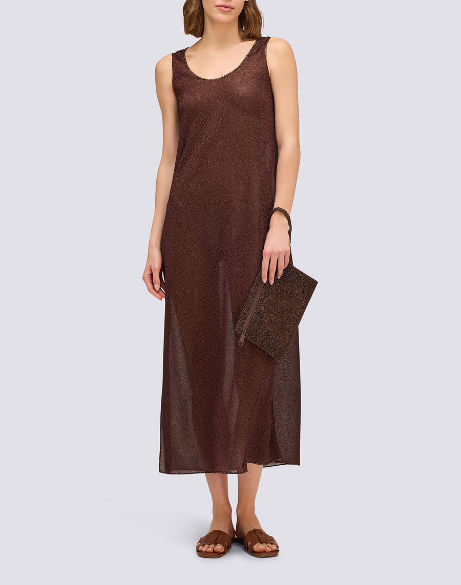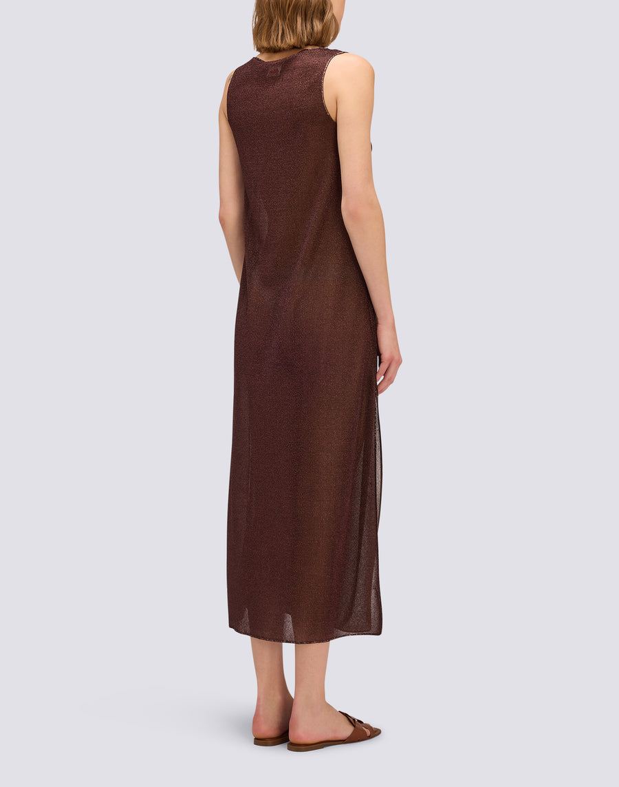 Abito donna lungo in lurex senza maniche, con spacchi laterali in fondo. Scintillante, glamour, ideale per essere indossato di sera o all'ora dell'aperitivo, versatile da spiaggia e da città.