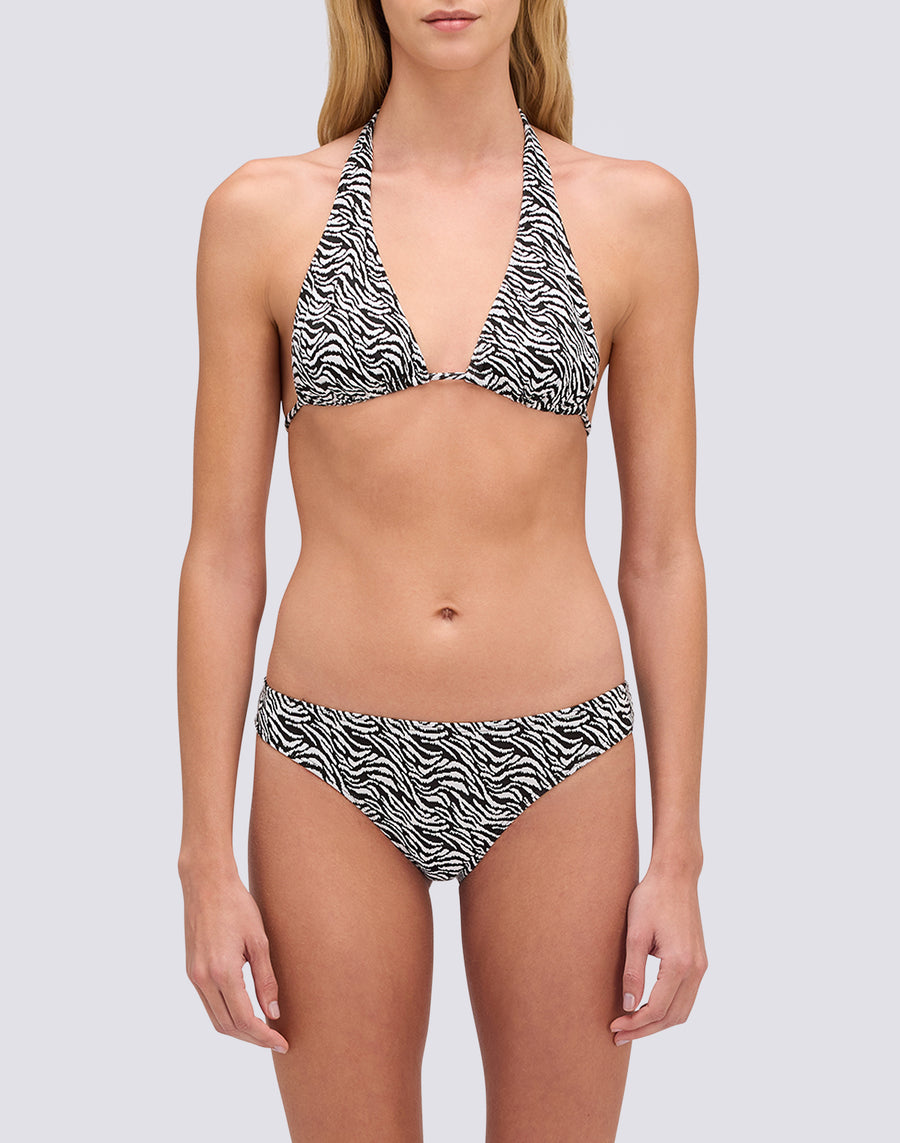 Il bikini top Hila a triangolo americano con fantasia zebrata in lycra jacquard unisce stile animalier e texture. La fantasia zebrata è il pattern animalier grafico e audace che aggiunge carattere. Design iconico con contrasti netti, perfetto per chi ama uno stile che si distingue.