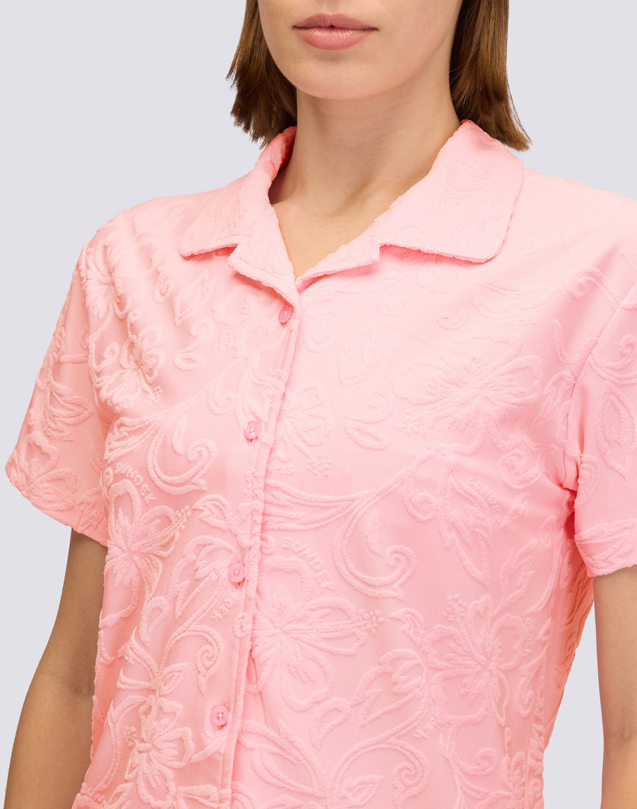 Camicia da donna modello bowling in spugna jacquard con motivo SK23, ideale da abbinare ai set bikini e al costume a pantaloncino dello stesso programma, per dare vita a look colorati e unici.