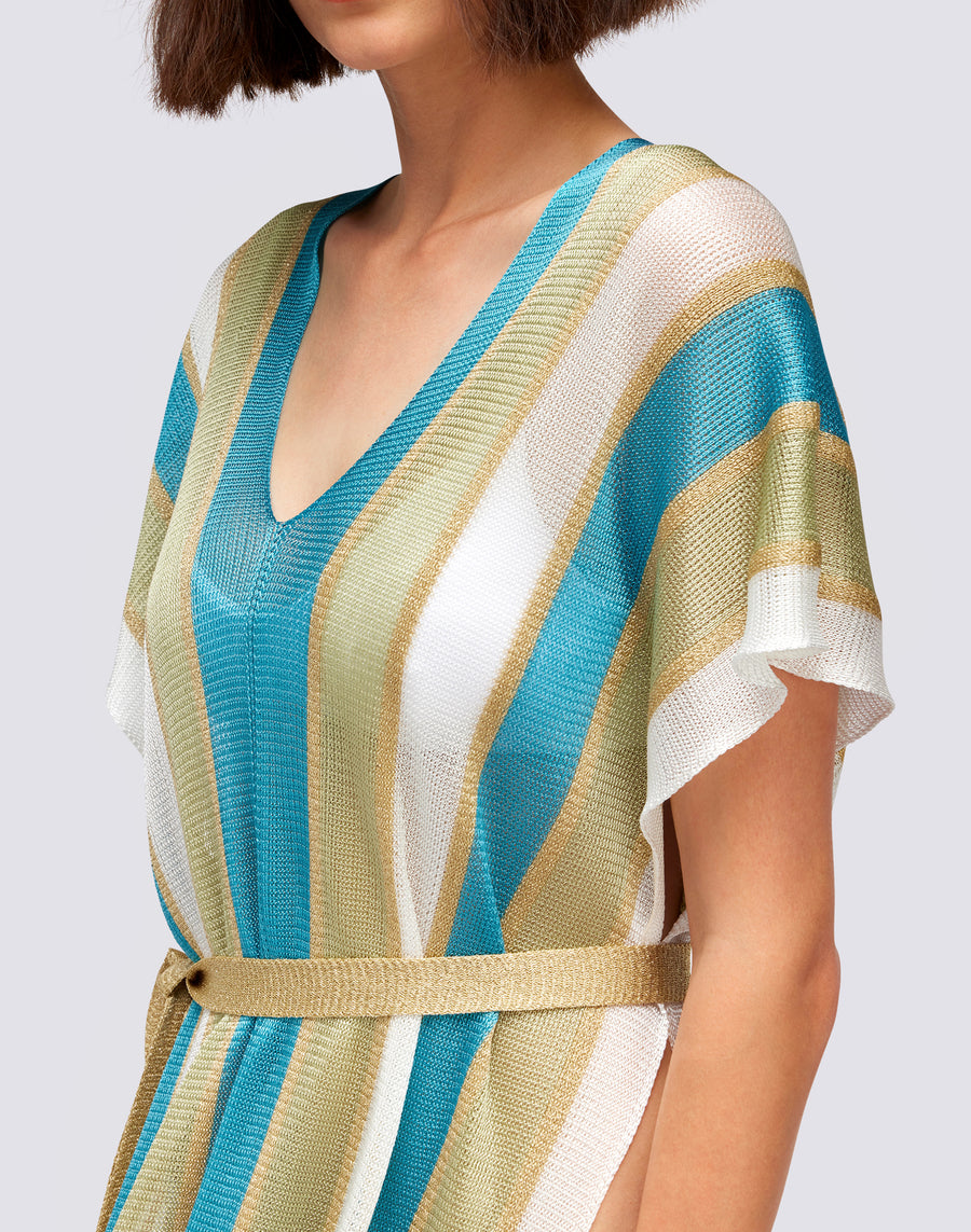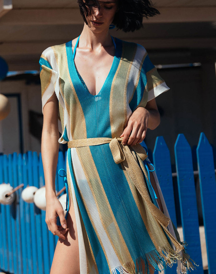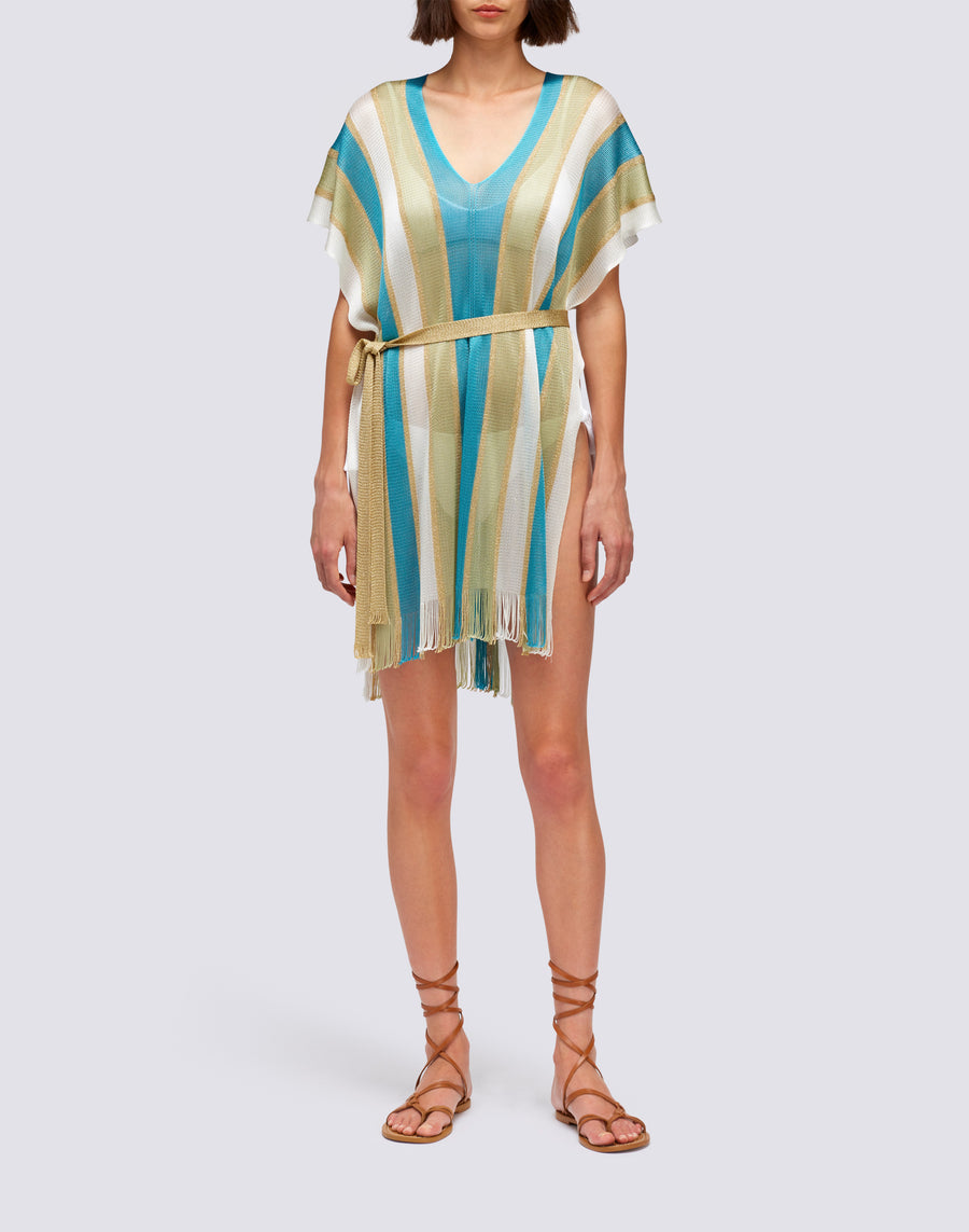 Aggiungi una nota di colore al tuo look estivo con il nostro kaftano in lurex. Con le sue frange e la cintura in vita, è la scelta perfetta per un outfit luminoso e sofisticato. Indossalo sopra i costumi per un tocco di stile in più.