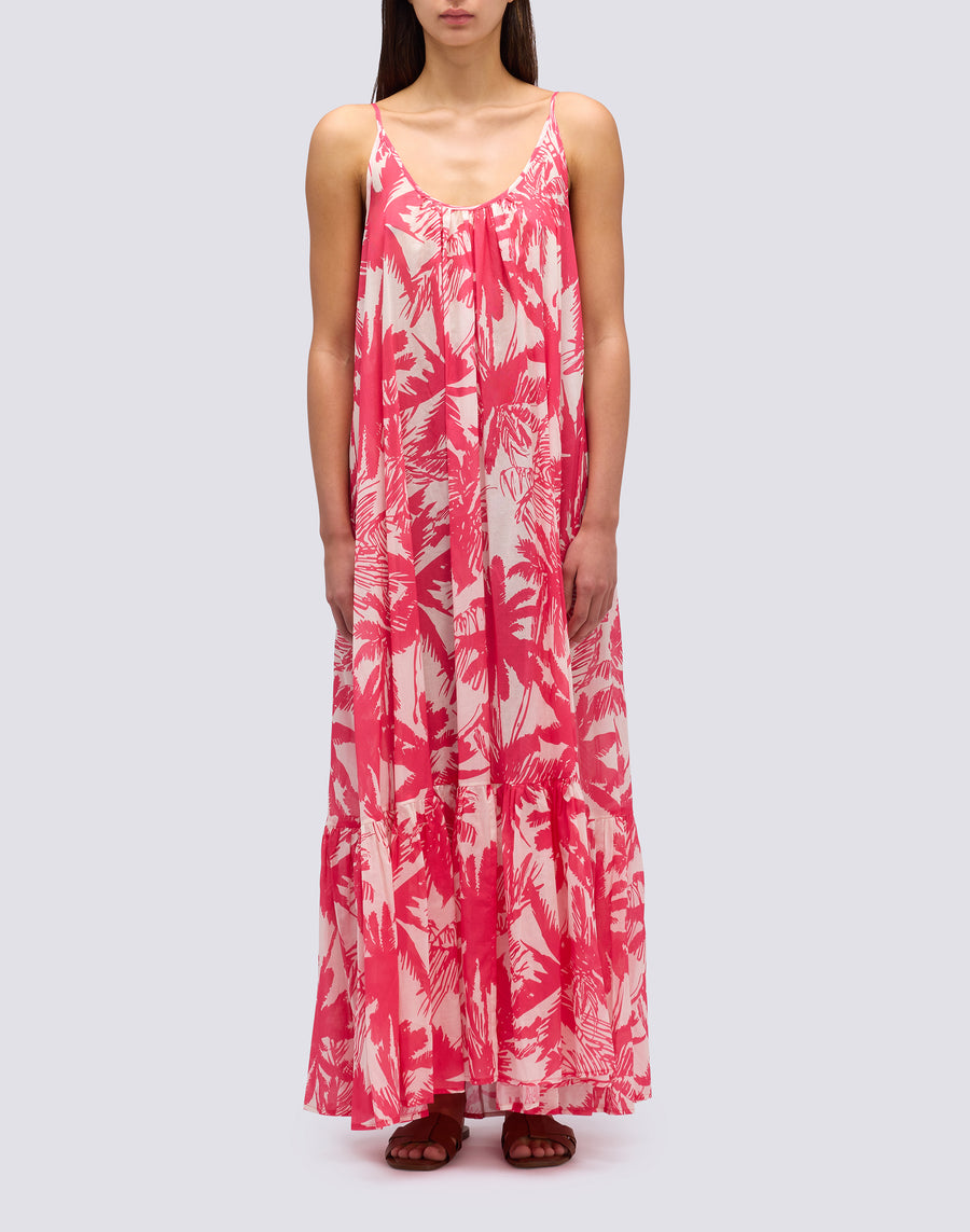 Aggiungi un tocco fresco e colorato al tuo guardaroba con l'abito lungo stampa Tropic Savana. Realizzato in un tessuto leggero, questo abito è perfetto per le giornate calde. Un must-have per l'estate!