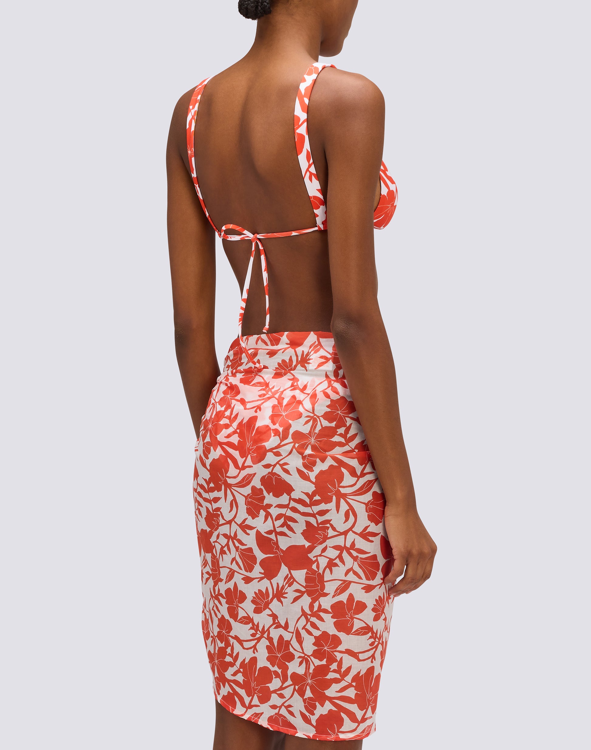 Pareo in cotone voile con stampa Patchy Flowera e nodo frontale. Un capo essenziale per dare vita a outfit da spiaggia colorati e vivaci, in coordinato con il set bikini nella stessa fantasia.