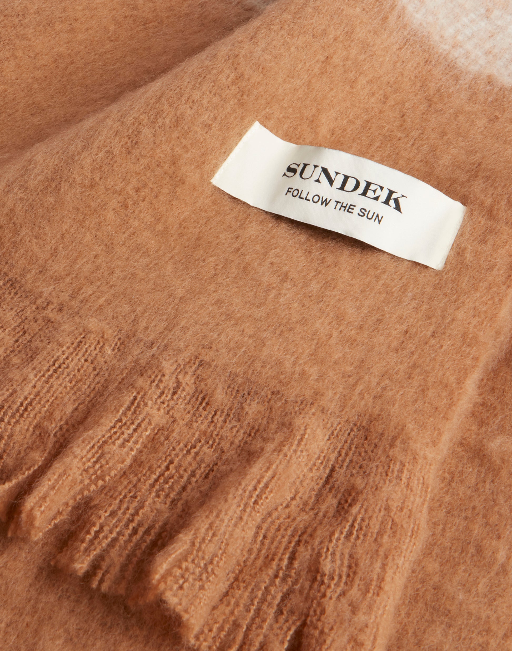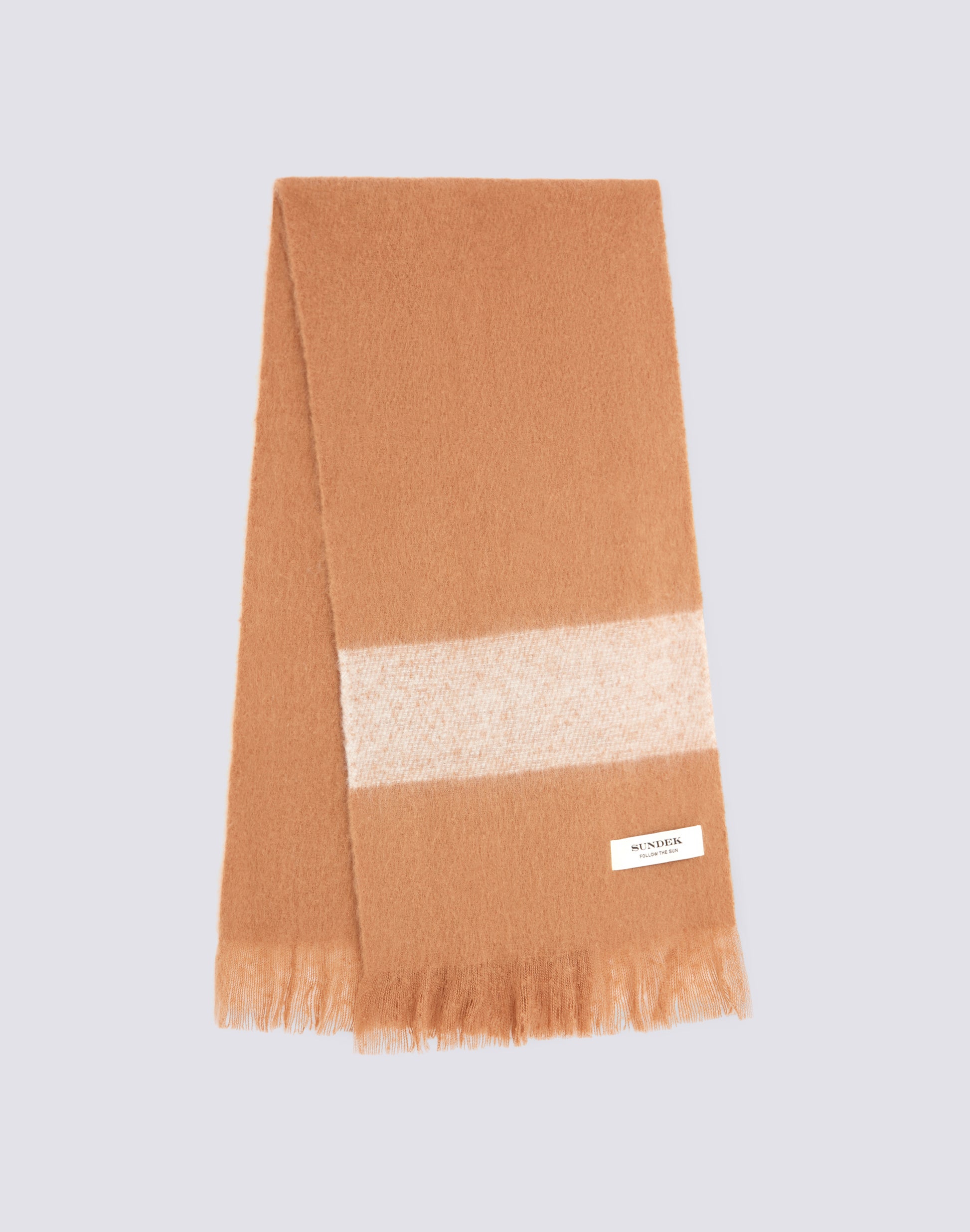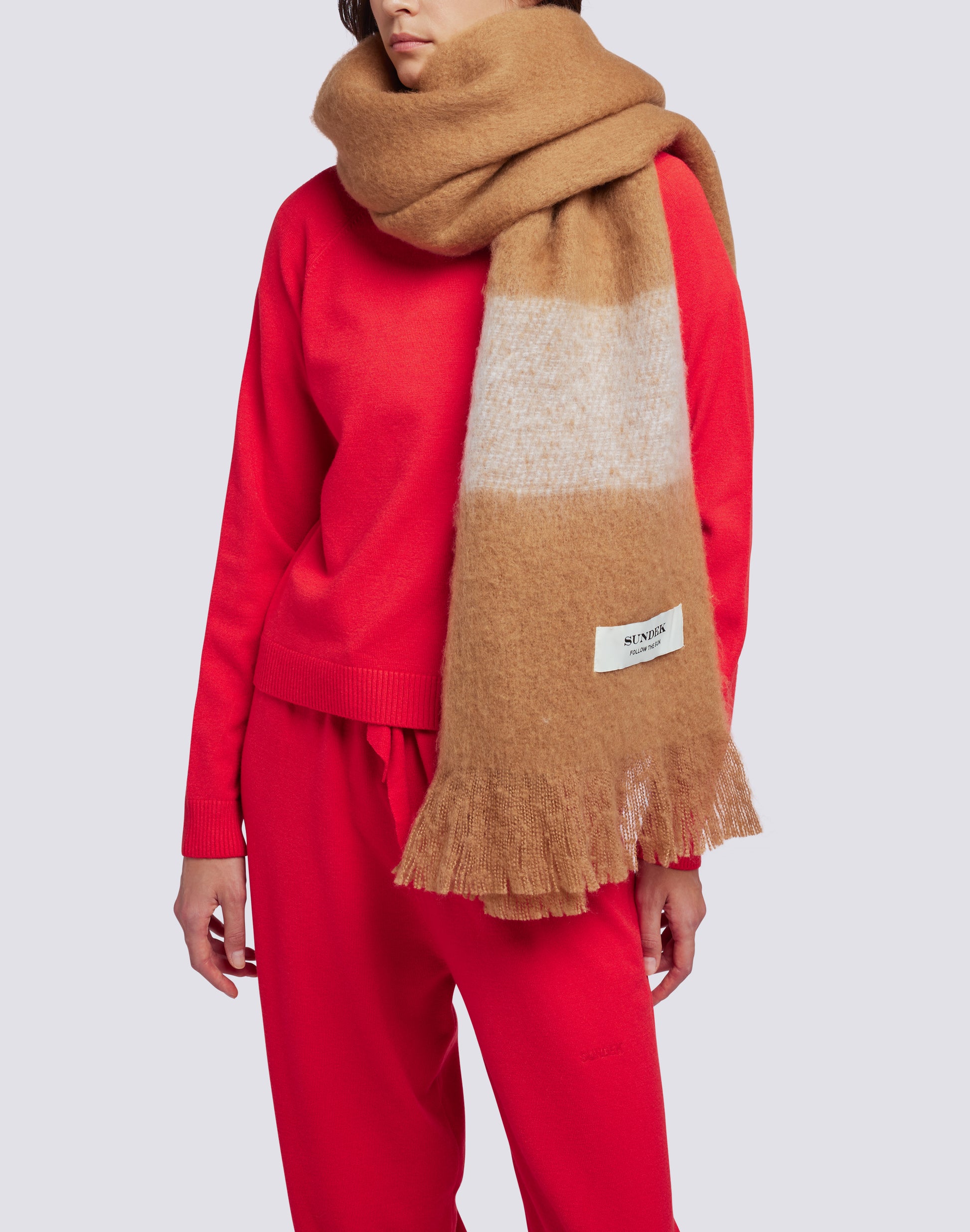Solid-coloured scarf with contrasting colour block, large logo label and mini fringes, the must-have accessory for winter days.
