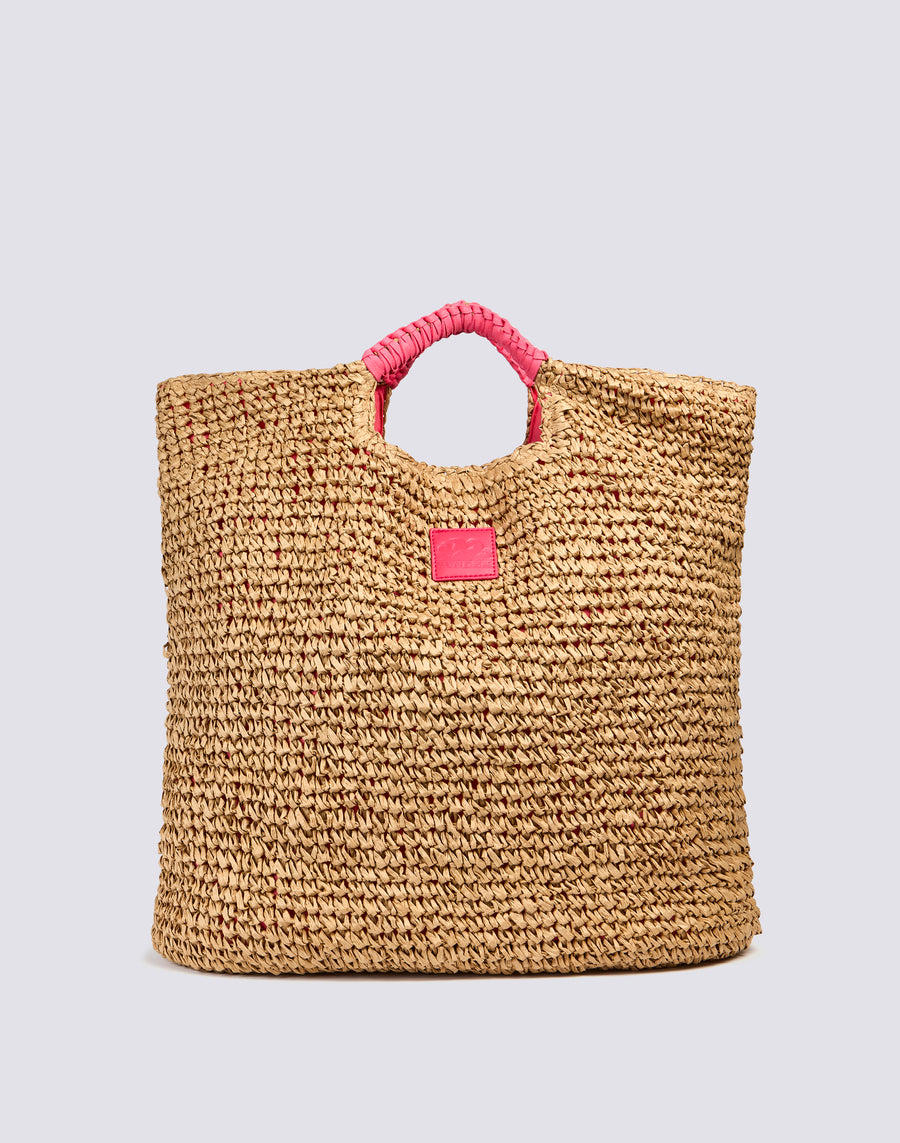 Woven paper straw maxi bag with central zip closure and handle. Roomy and original in design.