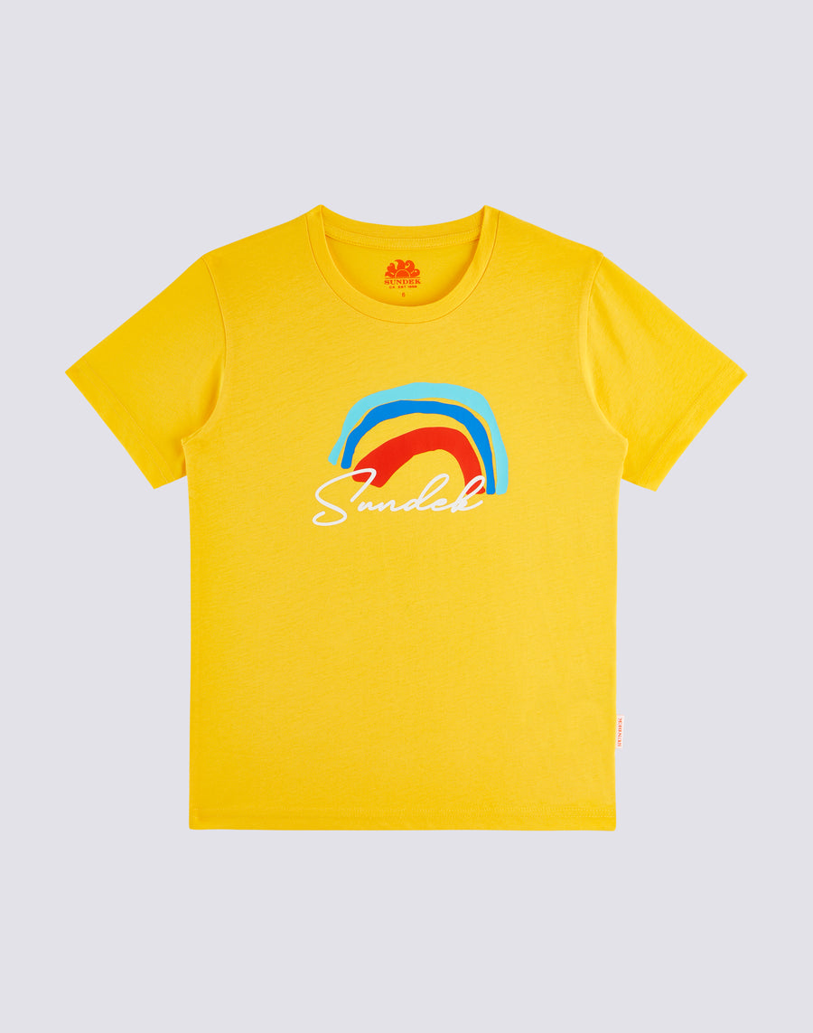 Children's t-shirt with Kiddoodle Rainbow front print. Crew neck collar and regular fit.