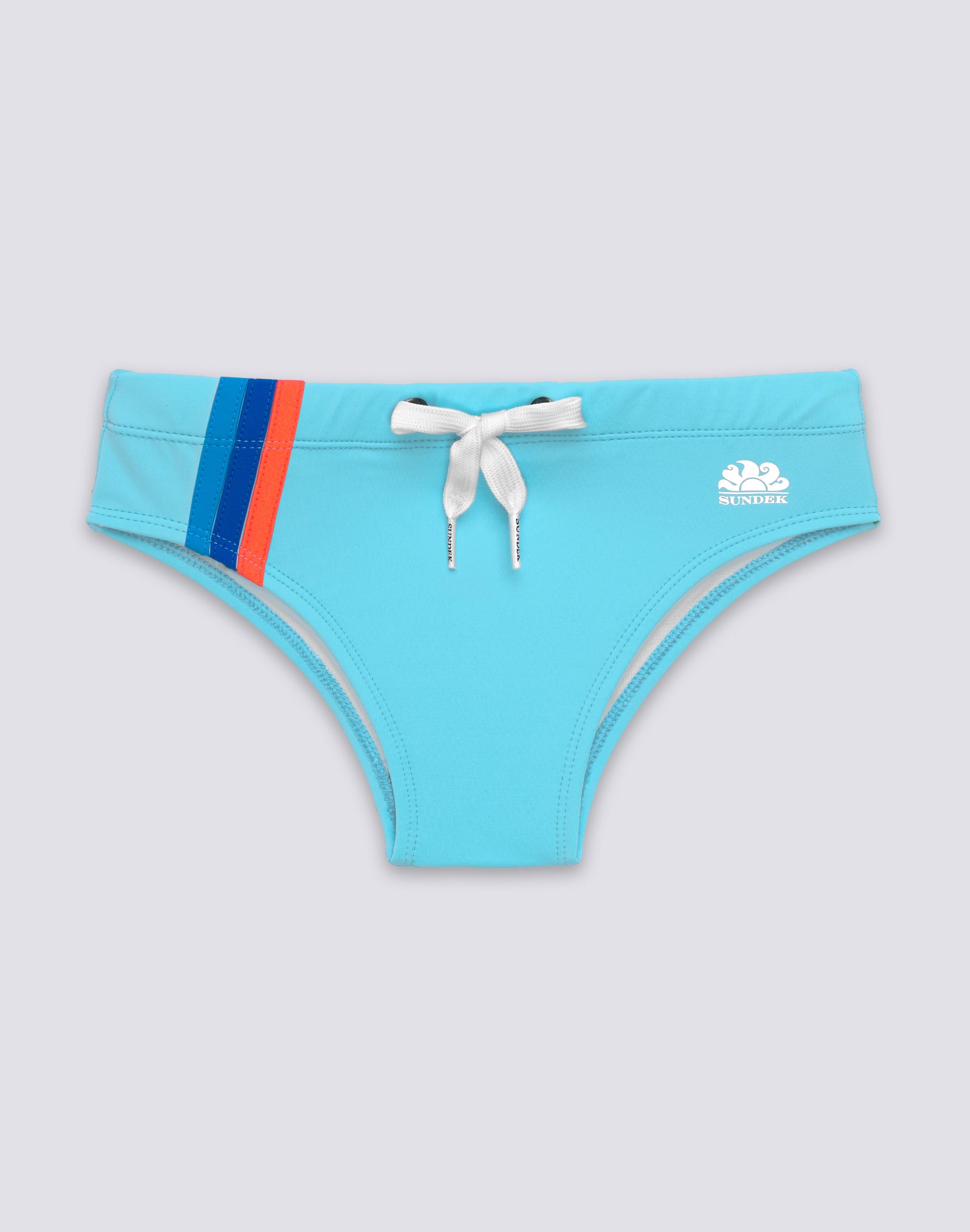 Immerse yourself in the colours of the rainbow. Boys' swim briefs in regenerated Econyl nylon, with tricolour detail on one side.
