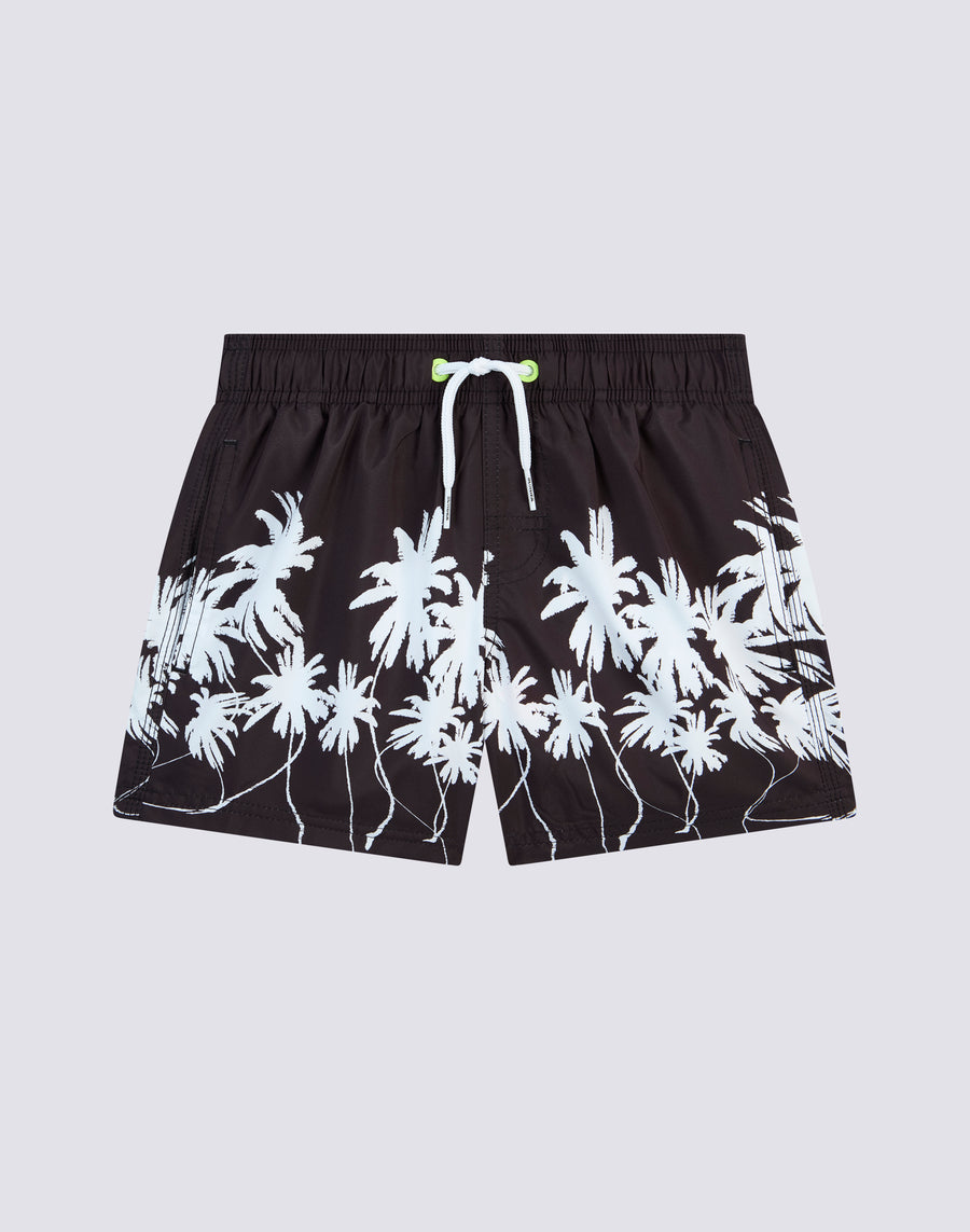 REPREVE® ELASTICATED WAIST SHORT SWIMSHORTS WITH BLACK PALM PRINT
