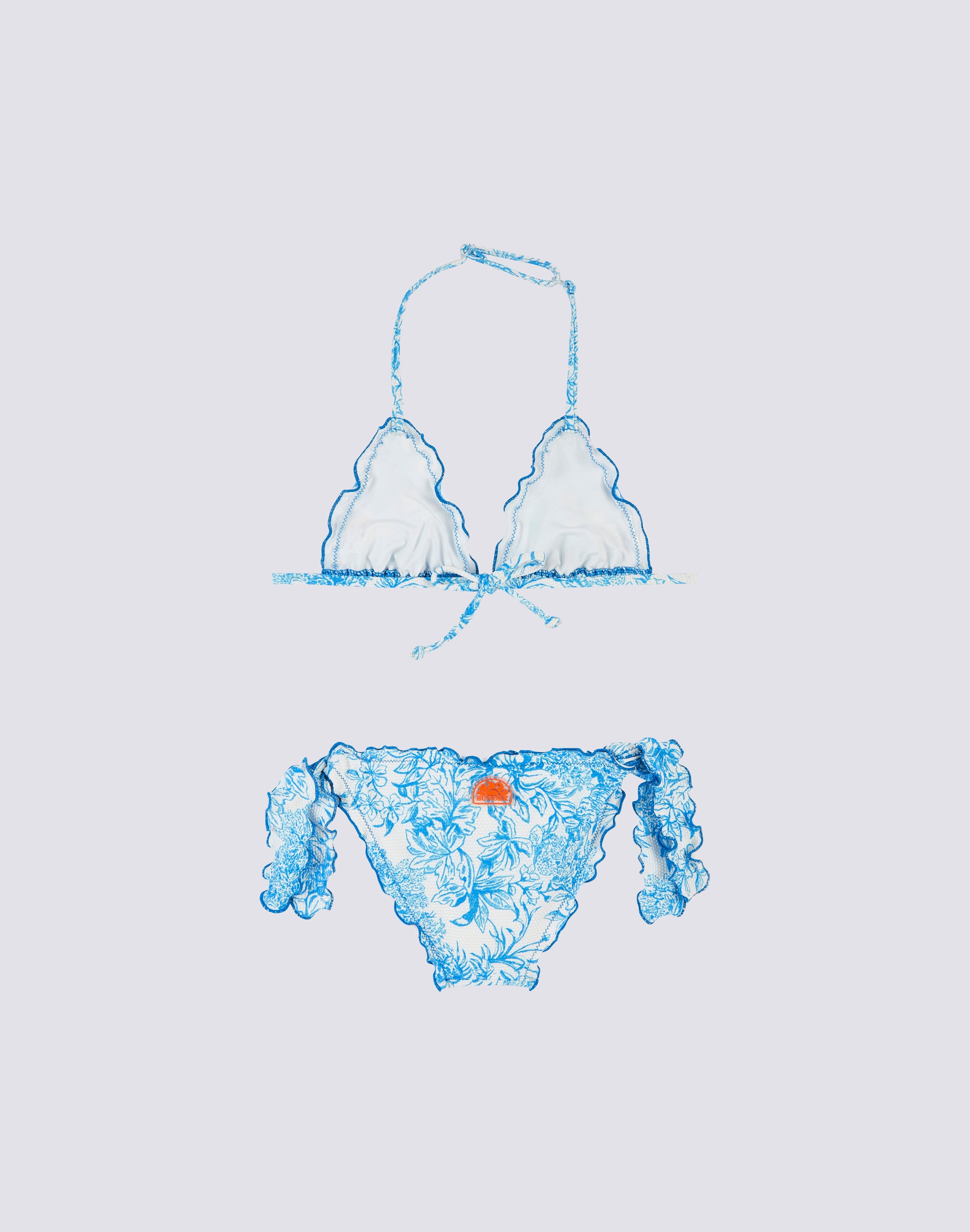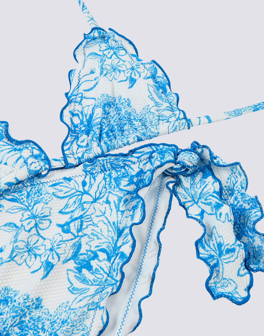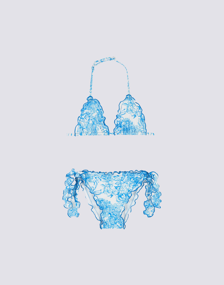 Magnolia mini bikini consisting of a ruffled adjustable triangle top and ruffled brief with bows. Fleur de Joie print and Piquet fabric. Matching model for a mix&match look on the beach.