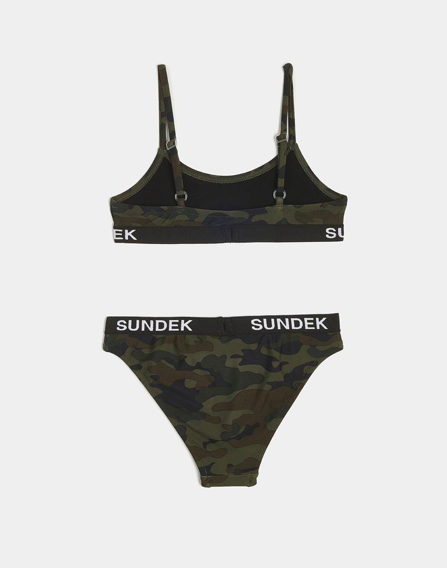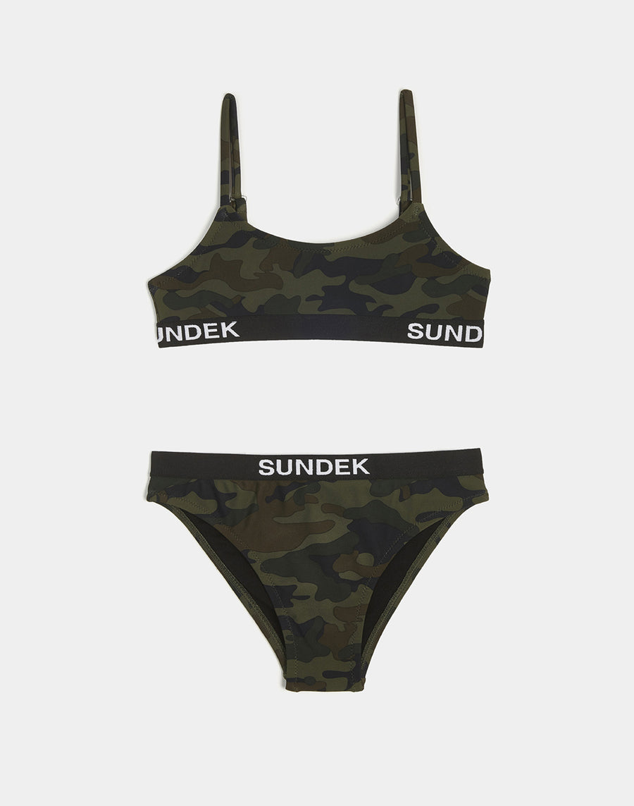 Made up of a bandeau top and briefs with an elasticated waistband, this girls' bikini is finished with a contrasting logo. The camouflage print adds an edgy flair, pairing perfectly with the matching dress. The strong, lightweight and comfortable high-per