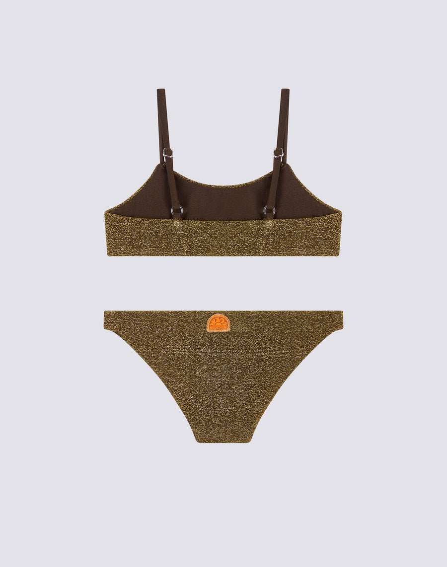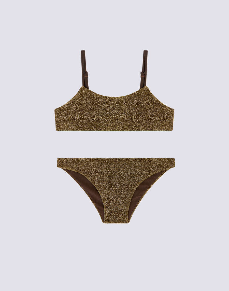 64% PA 36% EA Shiny lurex fabric, comfortable and with lining that guarantees a soft contact with the skin.