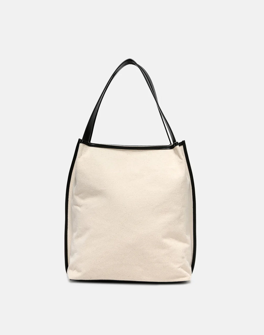 Spacious cotton canvas tote bag with contrasting faux leather details. Two comfortable handles to wear over the shoulder. Contrasting front patch pocket with logo