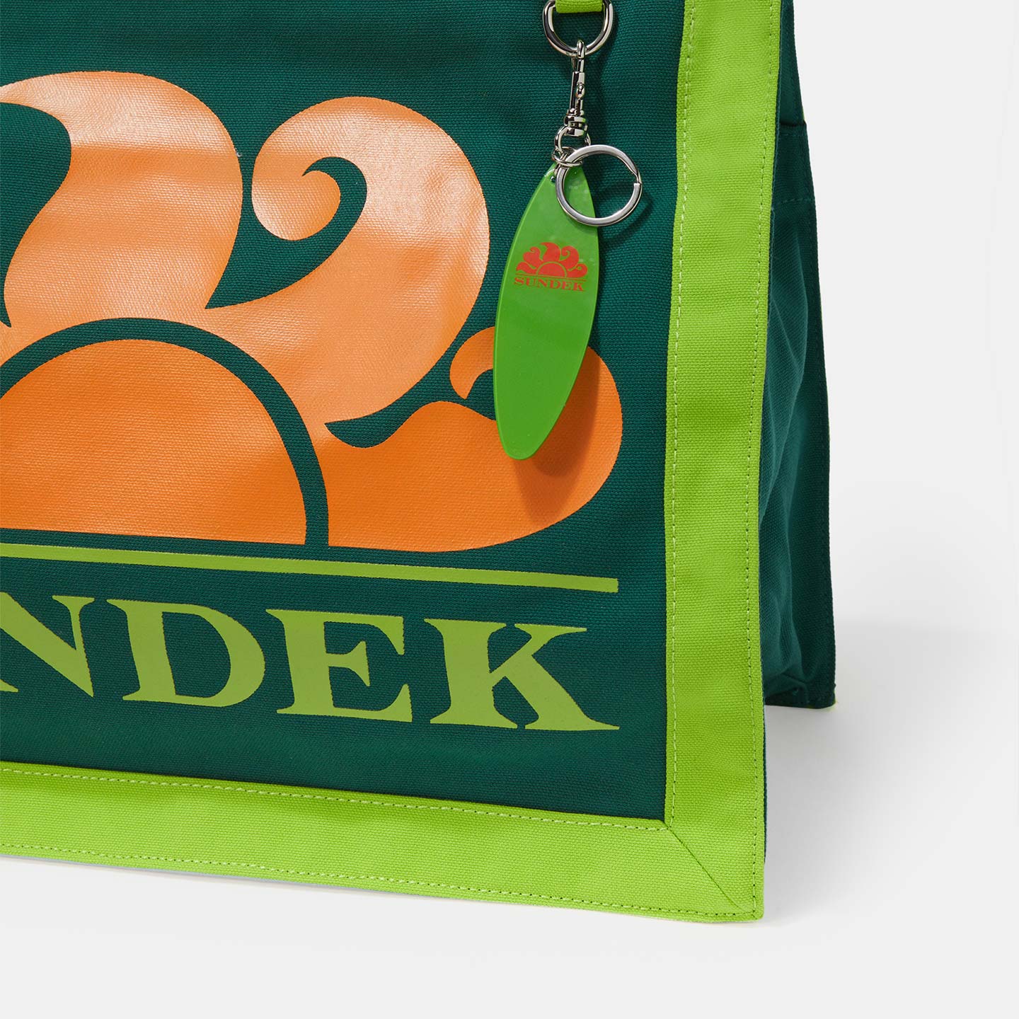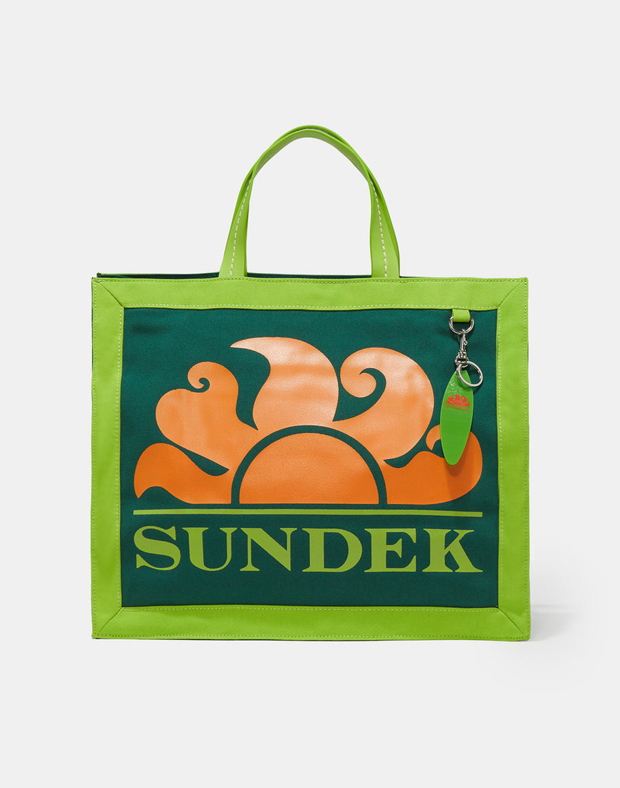 Canvas beach handbag with a printed logo. Large and spacious with an inside pocket and zip. Iconic surfboard charm