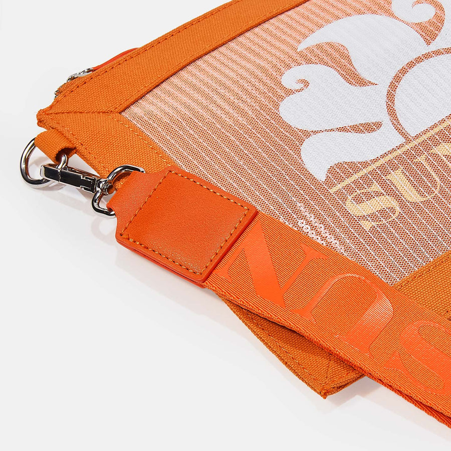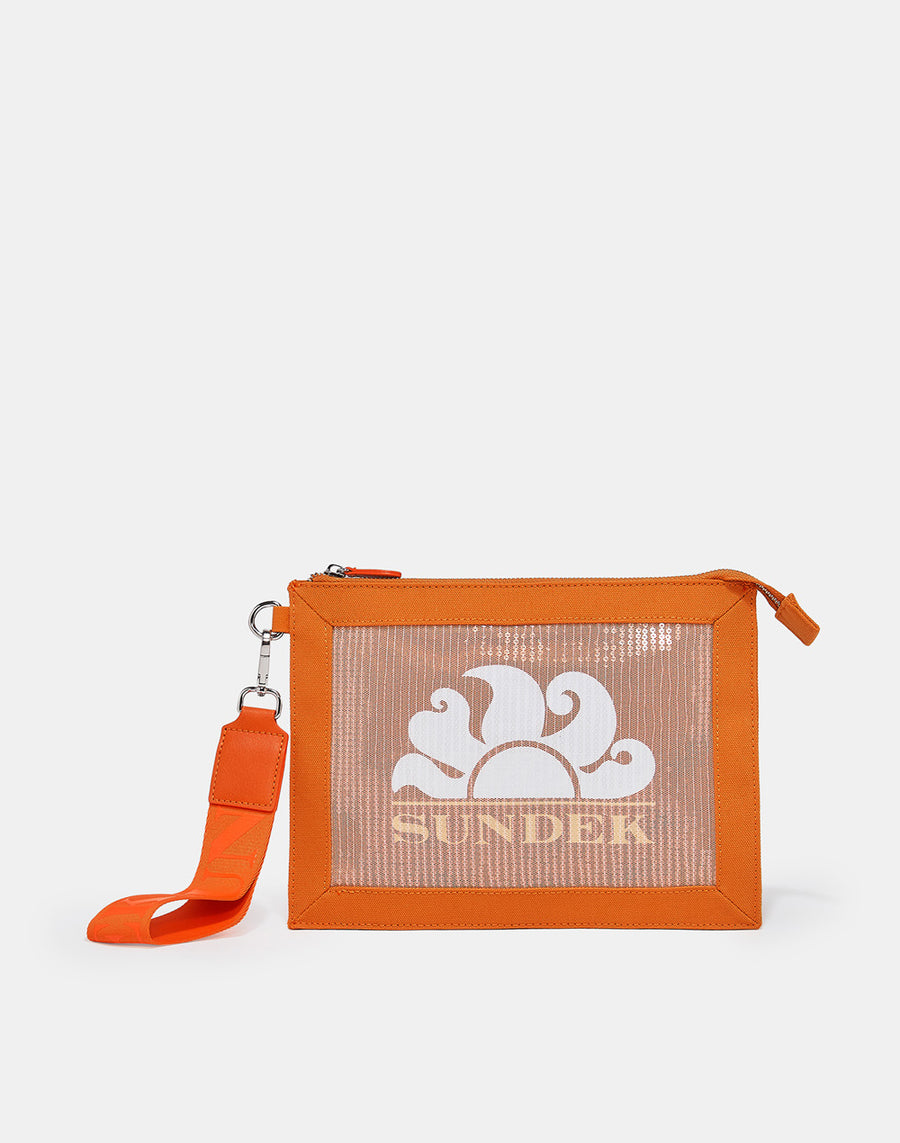 Sequinned mesh clutch bag with an embroidered Sundek logo. Perfect as a toiletry bag or a clutch bag. Detachable strap with the Sundek logo