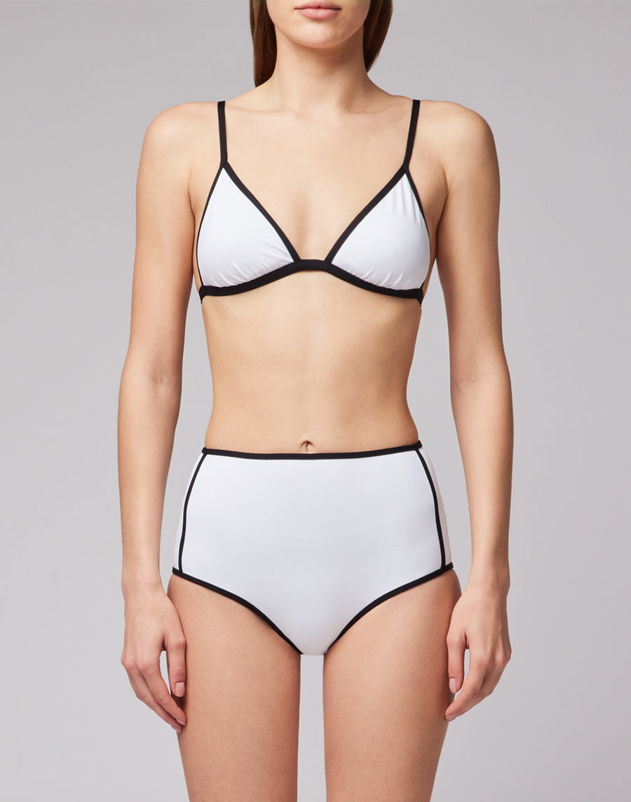 A unique and inimitable bralette top, with an elegant and sinuous line, highlighted by contrasting colors. For those looking for a refined beach style. Matching briefs sold separately.