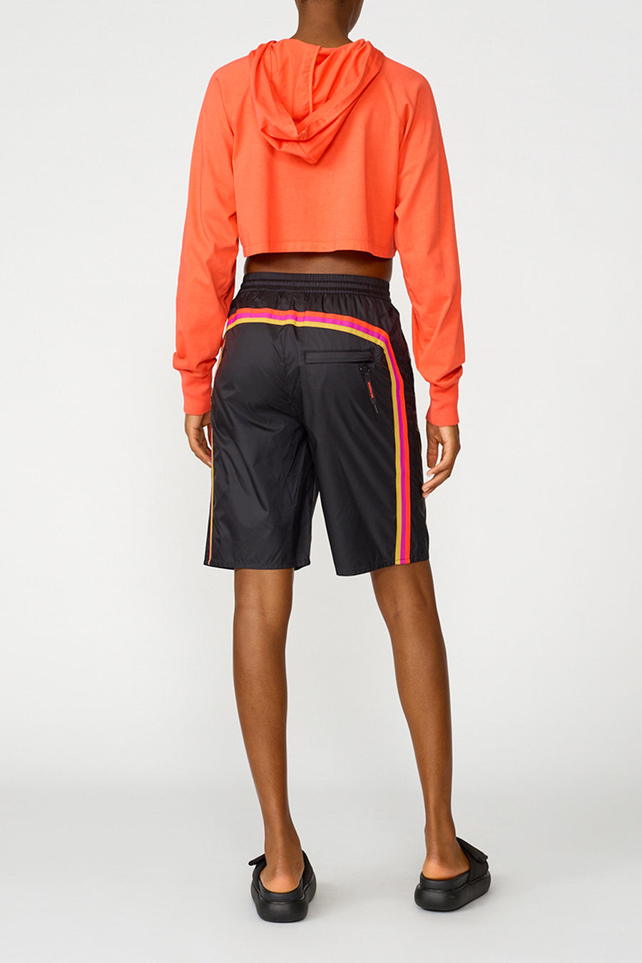 Follow the rainbow, choose the black shorts with rainbow side detail. Made of glossy ripstop material, it fits your silhouette thanks to the elasticated waist.
