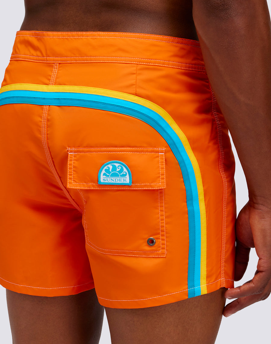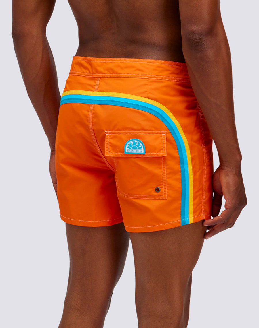 Vibrant energy, intense color and the iconic Sundek rainbow peeking out for this men's boxer shorts. It's made from our heritage nylon taffeta fabric, with a comfortable, quick-drying silky feel, while three-needle stitching makes it durable vacation after vacation. Length 35 cm (size M), measured on the outside of the leg.