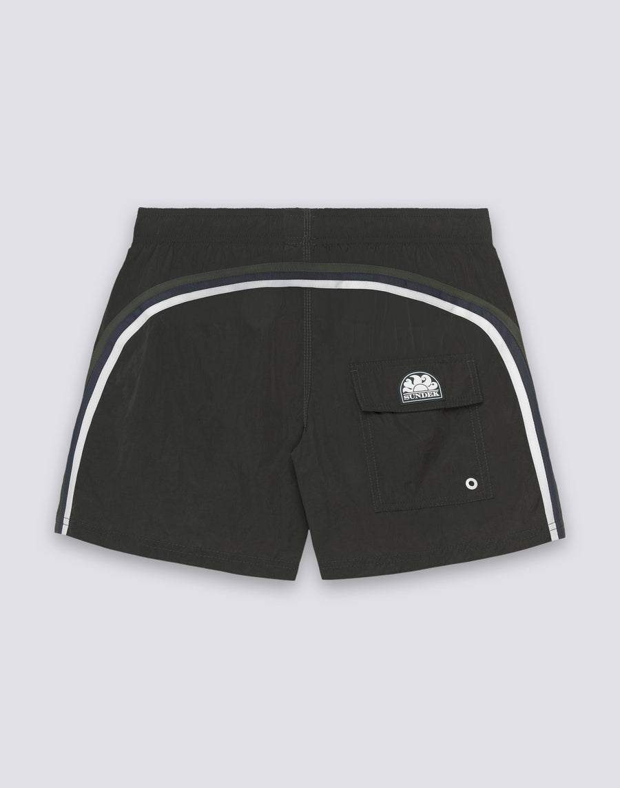 Solid-coloured short men's swimming costume in bright colours. Lightweight, durable, quick-drying and made of nylon taffeta, Sundek's iconic fabric. It has our classic three-needle stitching for durability and our rainbow on the back.