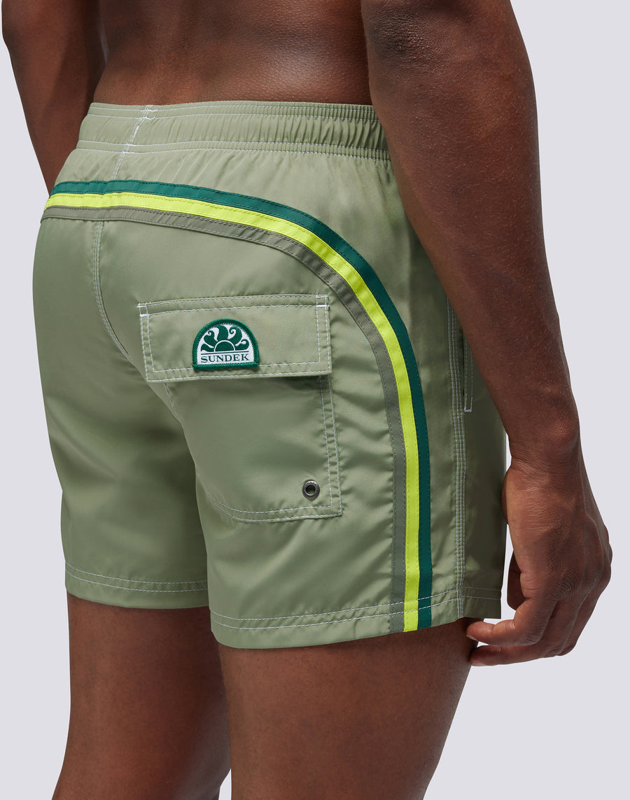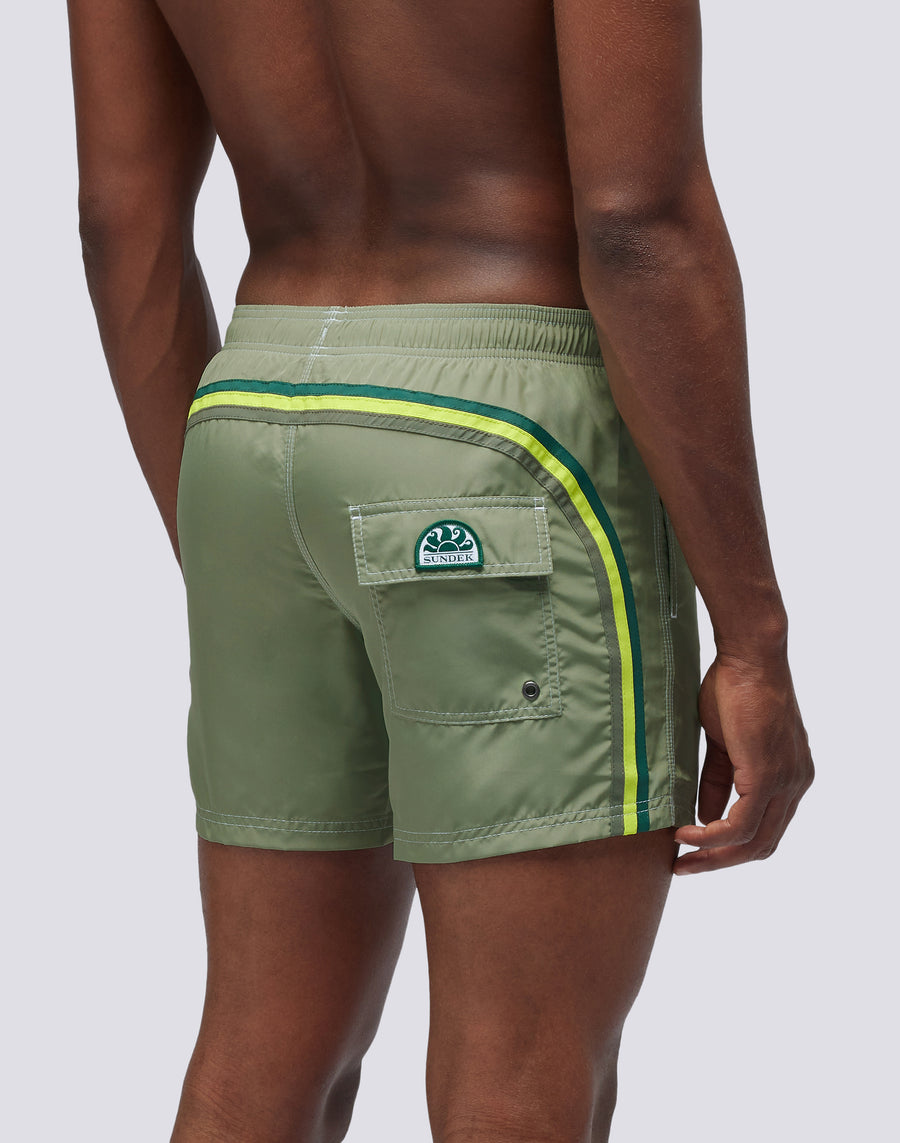 Short swimsuit with elasticated waist, made in our iconic Nylon Taffeta fabric. Equipped with triple stitching on the areas of greatest stress, it guarantees resistance and durability over time. The iconic rainbow characterizes the back. Length on the outer thigh 14''/35 cm (in size M).