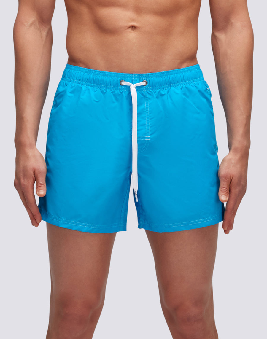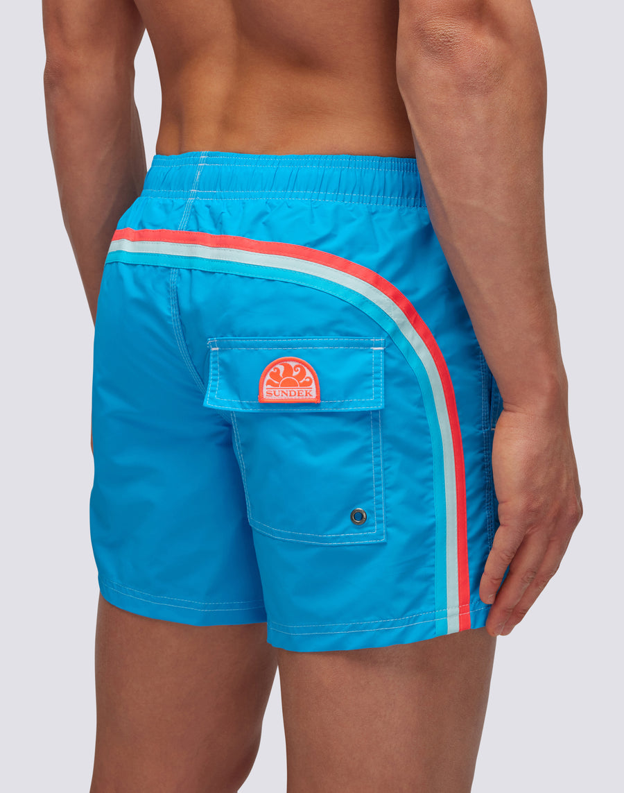 Short men's swim shorts with elasticated waist, drawstring and iconic Sundek rainbow on the back. This swimsuit is made with three-needle stitching and 100% of our historic fabric, nylon-taffeta: smooth as silk, light and resistant to everything, it dries very quickly to give you comfort everywhere, in the waves and outside waterfall. Length 35 cm (size M), measured on the outside of the leg.