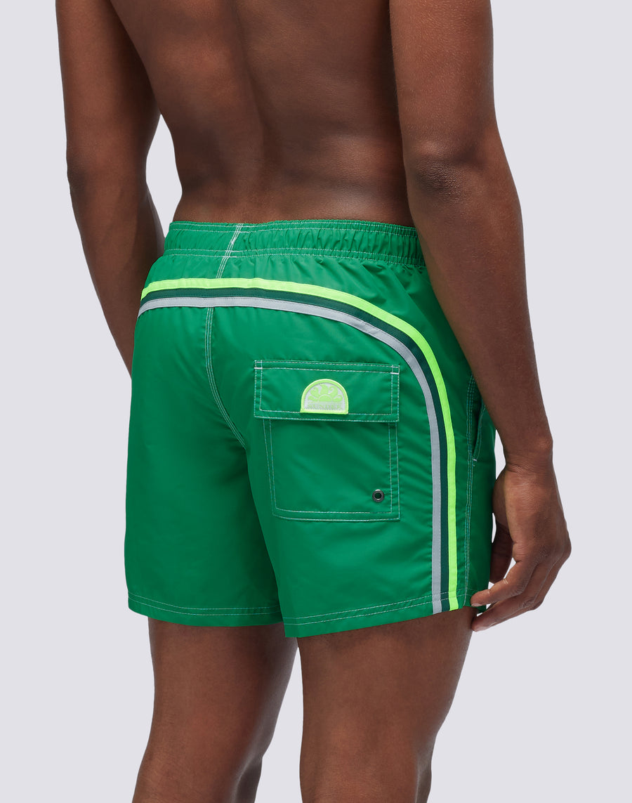 Short men's swim shorts with elasticated waist, drawstring and iconic Sundek rainbow on the back. This swimsuit is made with three-needle stitching and 100% of our historic fabric, nylon-taffeta: smooth as silk, light and resistant to everything, it dries very quickly to give you comfort everywhere, in the waves and outside waterfall. Length 35 cm (size M), measured on the outside of the leg.