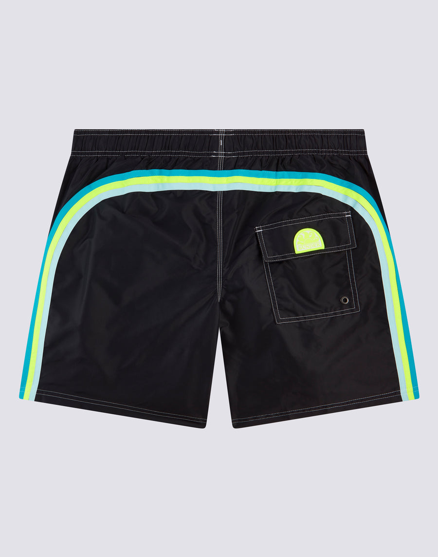 All of Sundek's timeless style in this mid-length, elastic-waisted boardshort. Stylish, comfortable, meant to last vacation after vacation: this is our classic boardshort with drawstring waist and contrasting rainbow back, made in our historic lightweight, quick-drying, durable nylon taffeta fabric with three-needle stitching for extra reinforcement. Length 41 cm (size M), measured on the outside of the leg.