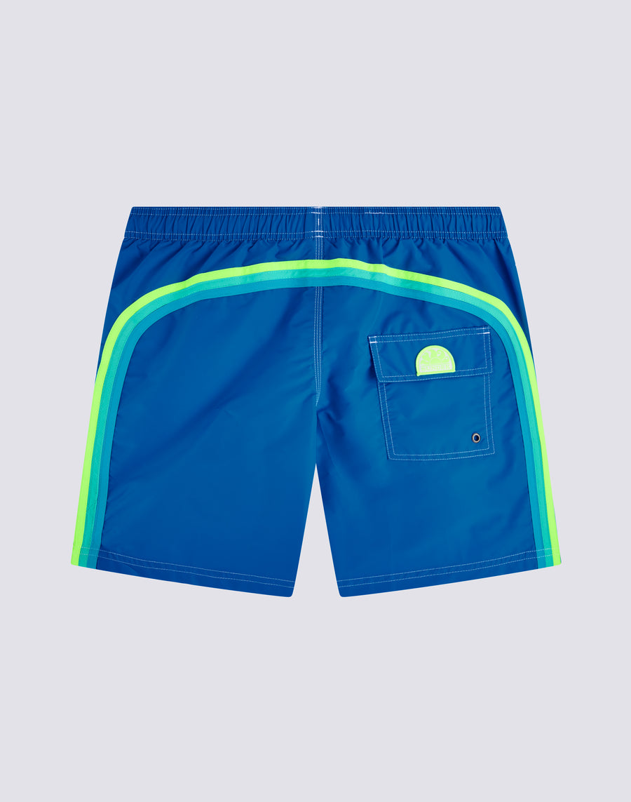 All of Sundek's timeless style in this mid-length, elastic-waisted boardshort. Stylish, comfortable, meant to last vacation after vacation: this is our classic boardshort with drawstring waist and contrasting rainbow back, made in our historic lightweight, quick-drying, durable nylon taffeta fabric with three-needle stitching for extra reinforcement. Length 41 cm (size M), measured on the outside of the leg.