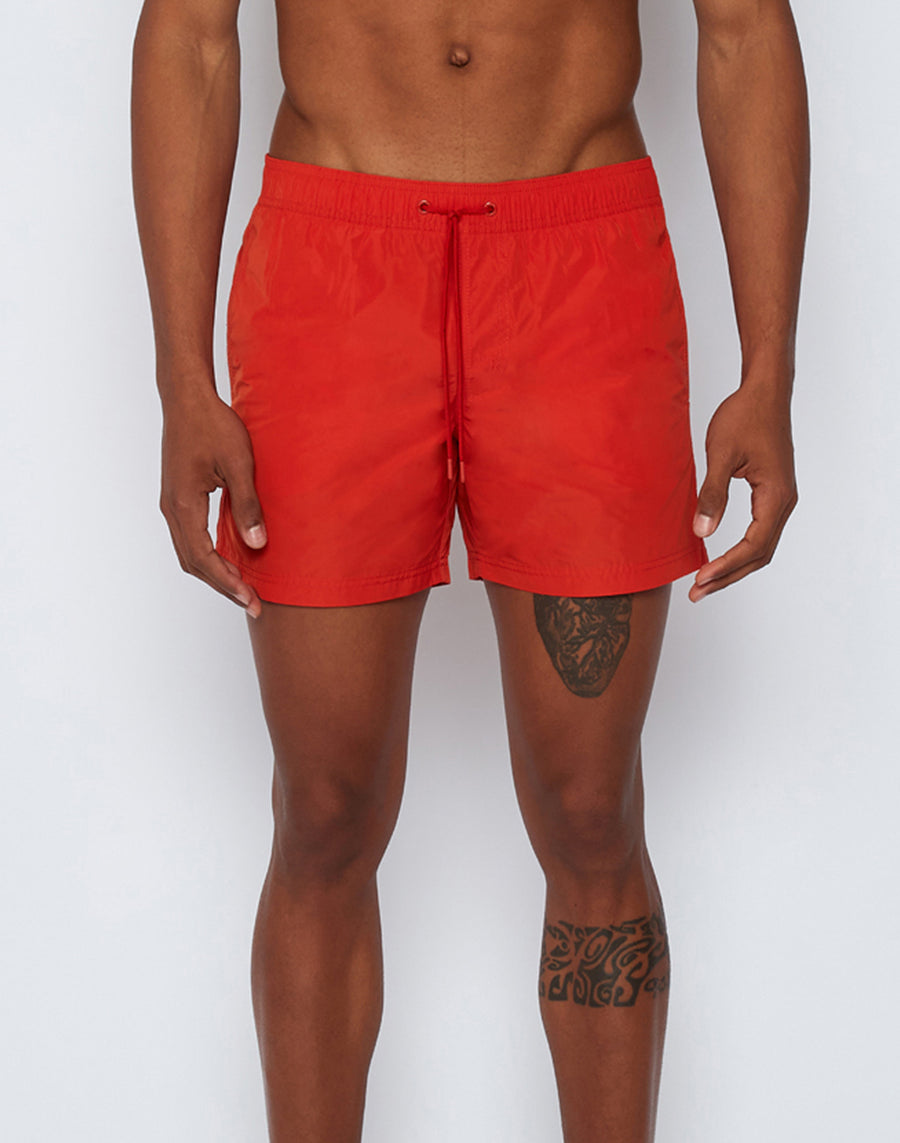 Plain-coloured short men's swimming costume with bright colours and a heat-sealed zip detail that closes the back pocket. Lightweight, durable, dries very quickly and is made of polyester memory, a technical fabric that retains its shape over time. It has our classic three-needle stitching for durability and our iconic rainbow on the back.