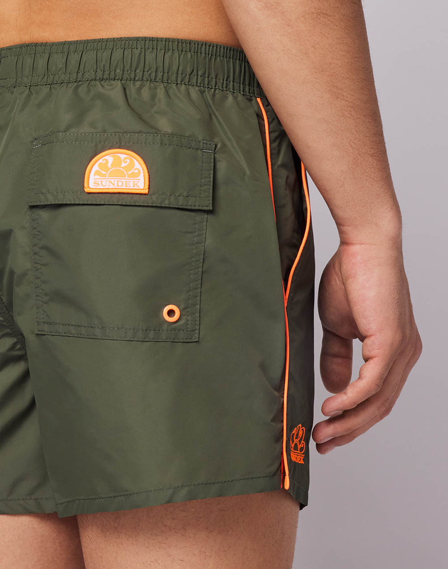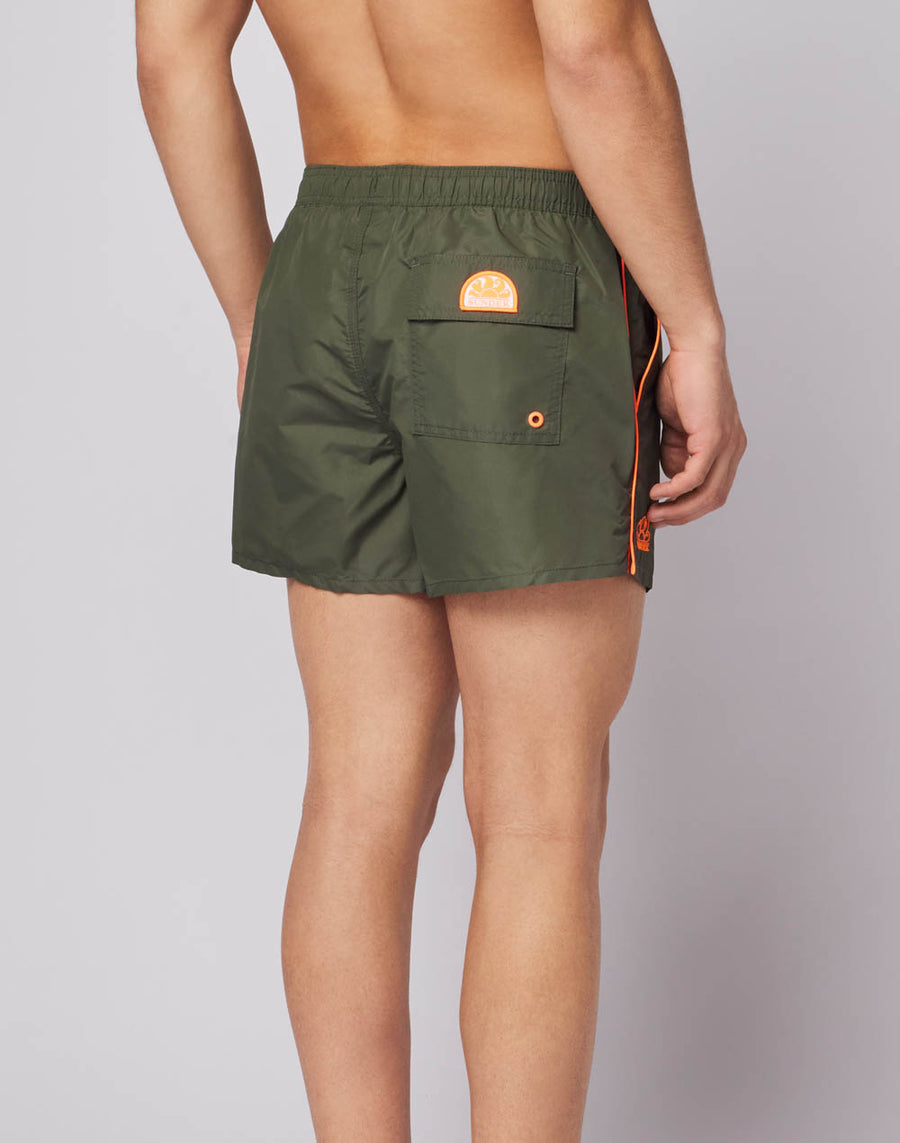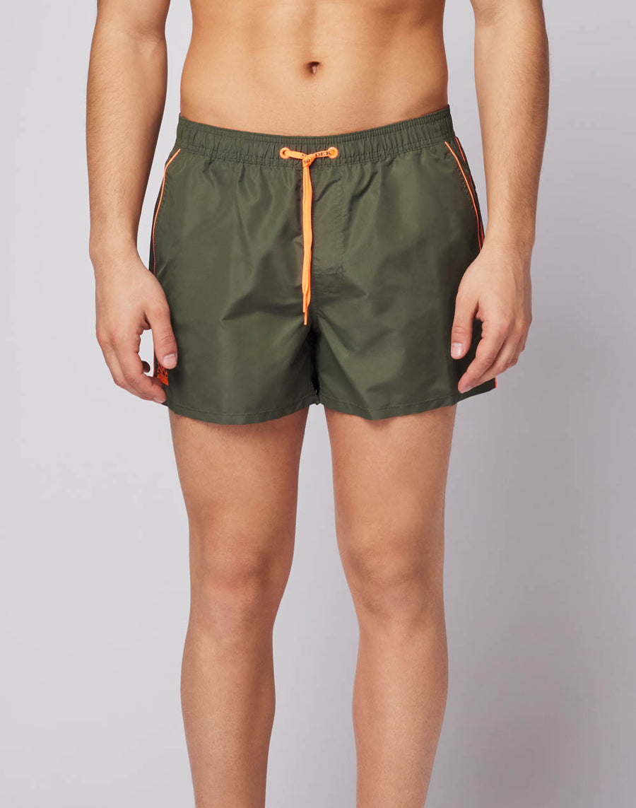 Coltrane short swimsuit with elasticated waist and contrasting piping on the front. The swimsuit features a drawstring and back pocket with velcro closure, as well as triple stitching on the areas of greatest stress to ensure optimal resistance. Length on outside leg 13"/33 cm (in size M).