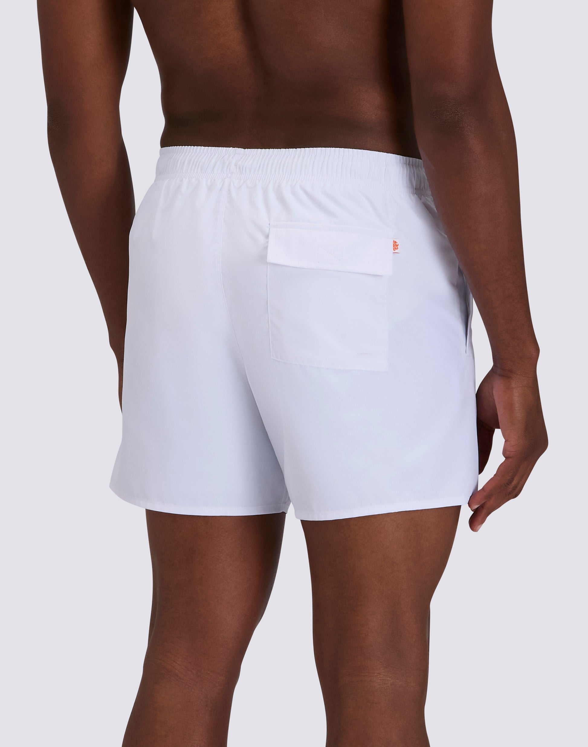 These men's swim shorts are made from micropeach nylon, a soft and velvety texture. With an elasticated waist and a short length of 38 cm, these swim shorts combine a pleasant feel against the skin with durability. Micropeach nylon is a technical fabric with a texture reminiscent of peach skin: soft, velvety and pleasant to the touch. This special finish is not only aesthetic, but also offers functional advantages: quick drying, lightness and wear resistance. A fabric that retains its shape over time, wash after wash. The three-needle stitching increases resistance to stress, ensuring that the swimsuit holds up even in the most demanding conditions. This reinforced construction is essential for those who practise surfing, swimming or intense water sports, where swimwear is subjected to constant stress. With a length of 38 cm (in size M), this men's swimsuit offers a versatile fit that is perfect for those seeking a balance between sportiness and comfort.