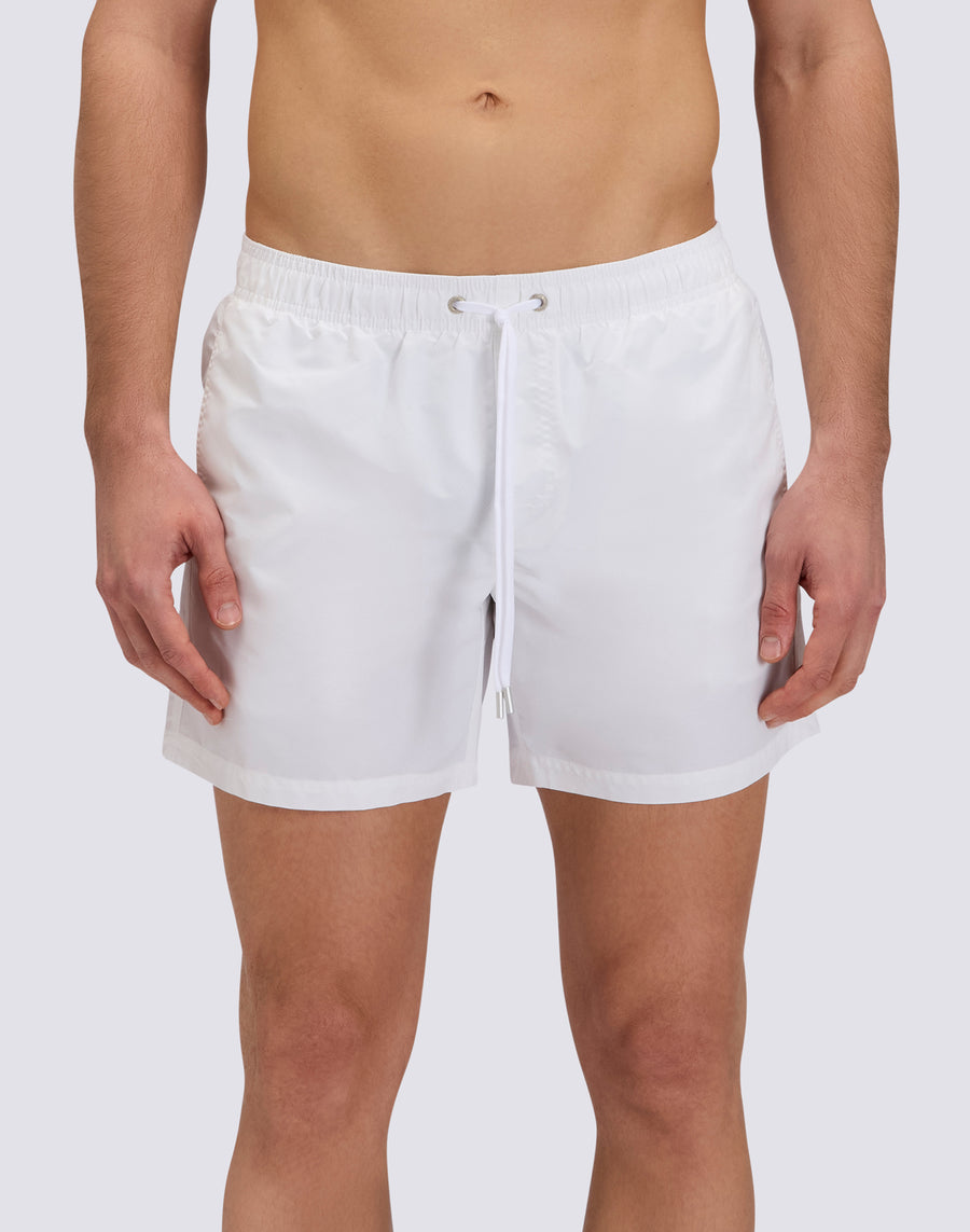Short men's swim shorts with an elasticated waistband, drawstring and iconic Sundek rainbow on the back. This swimming costume is made with three-needle stitching and 100% with our historical fabric, nylon-taffeta: silky smooth, light and resistant to everything, it dries fast to give you comfort everywhere, in the waves and out of the water. Also features a hidden back pocket.