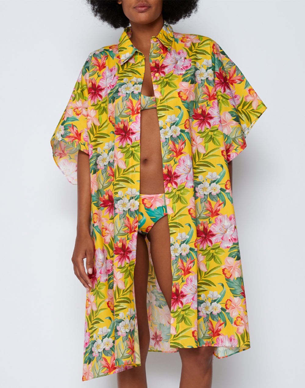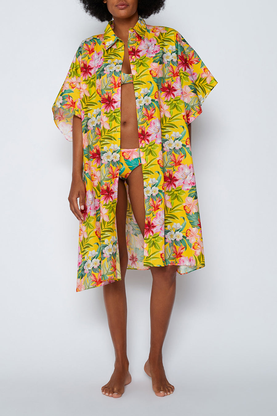 All the colors of Polynesia in this maxi cotton shirt with floral print. Perfect at the beach over a bathing suit or in moments of relaxation, to complete casual looks with a touch of liveliness.