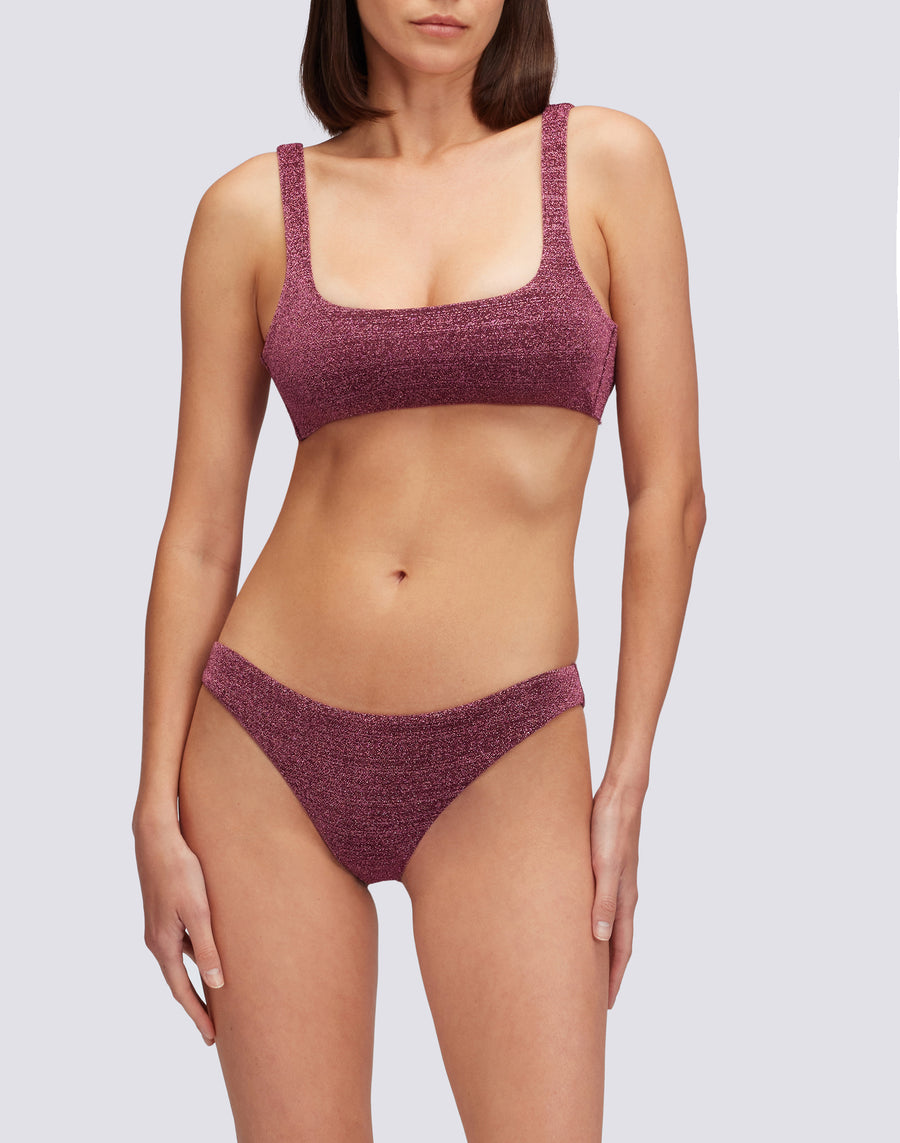 64% POLYESTER 36% ELASTANE Shiny lurex fabric, comfortable and with lining that guarantees a soft contact with the skin.