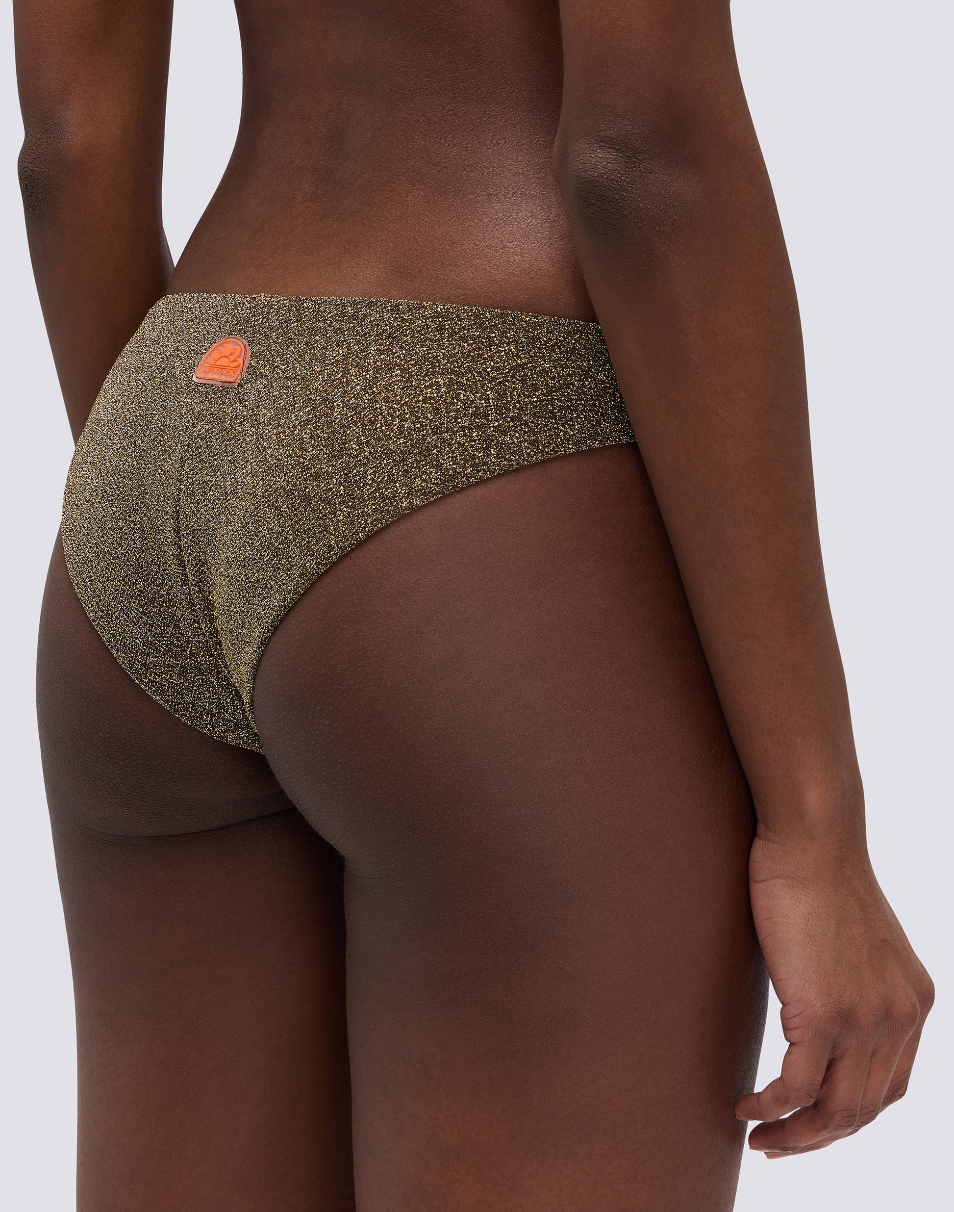 64% POLYESTER 36% ELASTANE Shiny lurex fabric, comfortable and with lining that guarantees a soft contact with the skin.