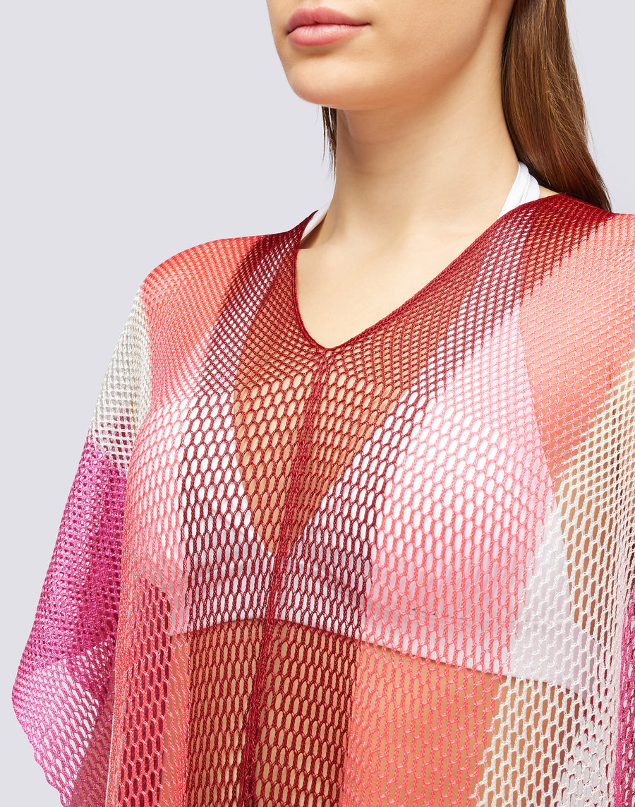 Colorful kaftan with fringes and V-neck. It falls softly over the bikini and gives a touch of elegance to the beach look.