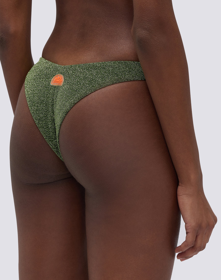 64% POLYESTER 36% ELASTANE Shiny lurex fabric, comfortable and with lining that guarantees a soft contact with the skin.