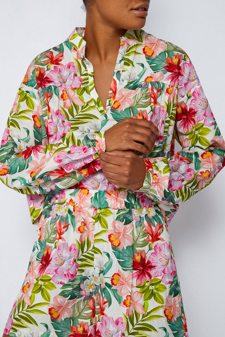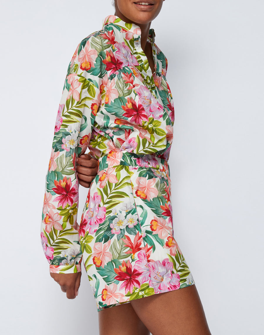 Let yourself be enchanted by these floral print cotton shorts. Fresh and lively, they are ideal to combine with the coordinated mandarin collar blouse.